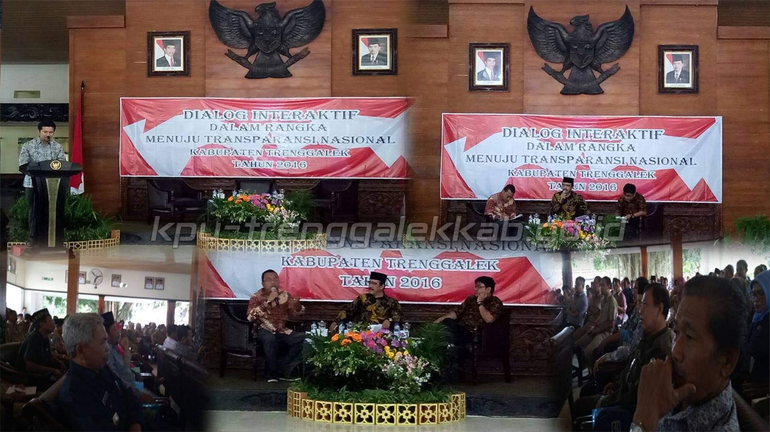 Untuk mewujudkan tata kelola pemerintahan yang baik dan bersih (good and clean goverment), Bupati Trenggalek Dr. Emil Elestianto, MSc mengahadirkan Freddy Reynaldo Hutagaul dari KPK (Komisi Pemberantasan Korupsi) dan Agus Sunaryanto Wakil Koordinator ICW (Indonesia Corruption Watch) Jakarta. Acara yang berlangsung pada hari ini Rabo (14/9/2016) bertempat di Pendopo Manggala Nugraha Trenggalek dikemas dalam bentuk Dialog Interaktif bertema “Menuju Transparansi Nasional”. Disamping Ketua KPU Trenggalek, pada kesempatan tersebut tampak hadir seluruh jajaran Forpimda, Kepala SKPD, Anggota Muspika, Kepada Kelurahan/Kepala Desa se-Kabupaten Trenggalek, Pimpinan Parpol, Ormas dan LSM.