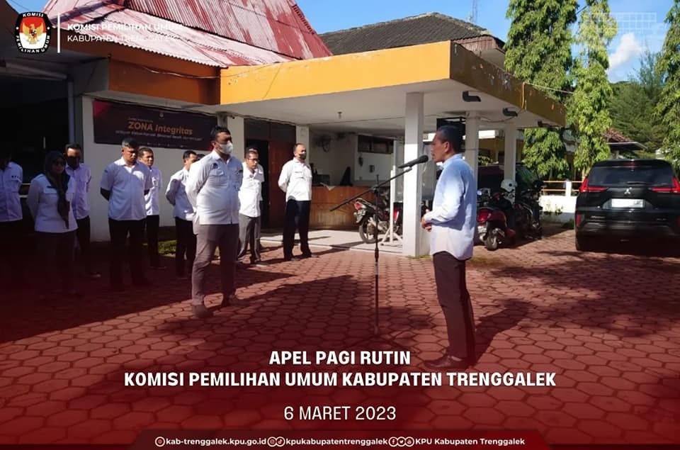 TRENGGALEK — Hari ini, Senin, tanggal 6 Maret 2023, pukul 08.00 sampai dengan 08.30 WIB, Komisi Pemilihan Umum (KPU) Kabupaten Trenggalek menyelenggarakan Apel Pagi Rutin. Kegiatan tersebut diikuti oleh seluruh Komisioner, Sekretaris, Kasubbag, Staf ASN,dan PPNPN KPU Kabupaten Trenggalek dan dipimpin oleh Akhmad Rudy Bastari, Kasubbag Keuangan, Umum, dan Logistik.