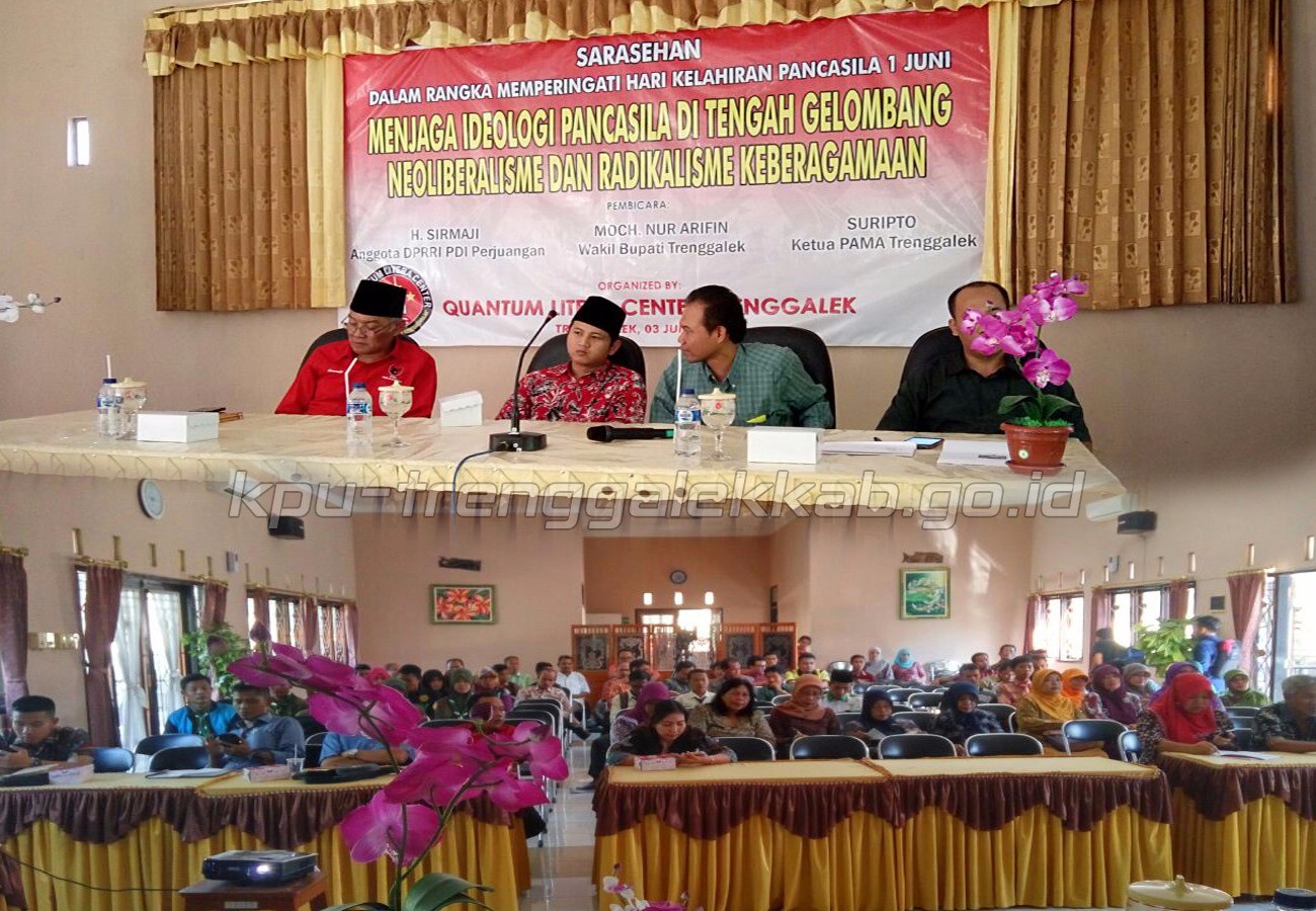 KPU-TRENGGALEKKAB.GO.ID. Sejumlah tokoh penting di Kabupaten Trenggalek terdiri dari, Politisi, Akademisi, LSM, Osis dan birokrat hadir di Aula Gedung Balai Benih Ikan (BBI) Trenggalek pada hari Jum’at (03/06/2016) untuk mengikuti peringatan hari Pancasila. Acara yang dikemas dalam bentuk Sarasehan yang diikuti 150 peserta ini mengambil tema ”Menjaga Ideologi Pancasila di Tengah Gelombang Neoliberalisme dan Radikalisme Beragama”. Pada kegiatan sarasehan tersebut menghadirkan tiga orang narasumber, yaitu Drs.H.Sirmadji, MPd (Anggota DPR RI/FPDIP), H. Mochamad Nur Arifin (Wakil Bupati Trenggalek) dan Suripto (Ketua KPU Trenggalek).