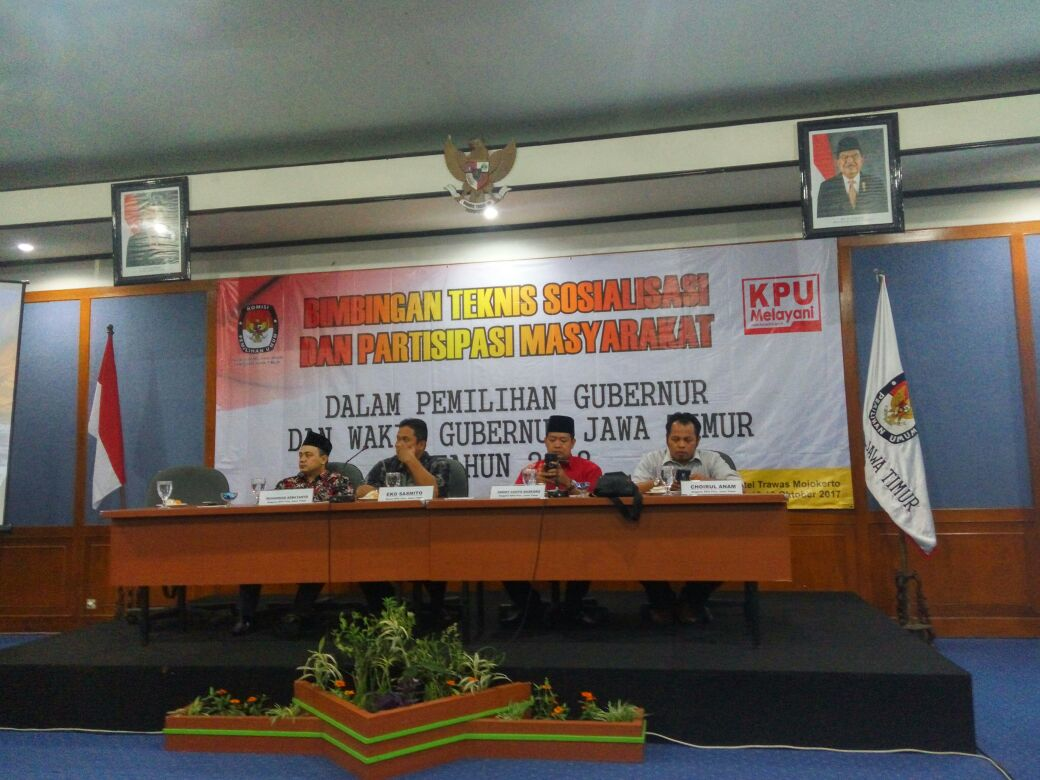 Komisi Pemilihan Umum(KPU) Provinsi Jawa Timur menggelar bimbingan teknis sosialisasi dan partisipasi masyarakat dalam pemilihan gubernur dan wakil gubernur Jawa timur tahun 2018 di Hotel Trawas Mojokerto. Kegiatan ini dihadiri oleh 4 orang Komisioner KPU provinsi , ketua KPU kabupaten / kota, divisi sdm dan partisipasi masyarakat KPU kab/kota dan kasubag teknis hupmas KPU kab/kota se Jatim.