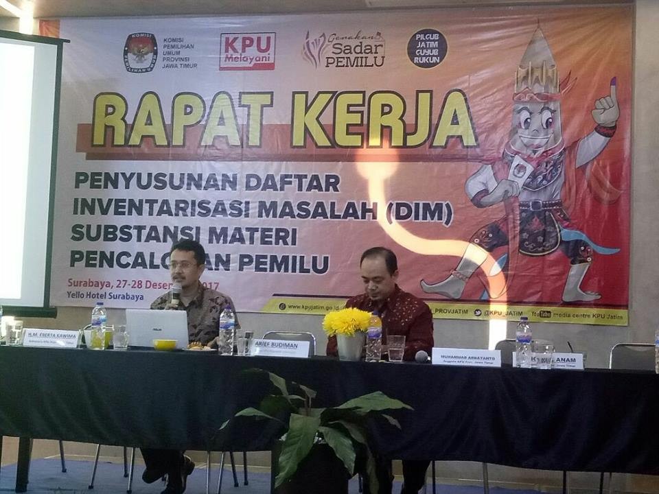 SURABAYA – Komisi Pemilihan Umum (KPU) sebagai lembaga yang paling terbuka mengalahkan KPK dan PPATK harus terus menjaga kepercayaan publik. Demikian pesan yang terlontar dari Dr.Ferry Kurnia Riskiyansyah, MSi , mantan komisioner KPU RI yang tadi sore hadir dalam acara Rapat Kerja Penyusunan Daftar Inventarisasi Masalah (DIM) Substansi Materi Pencalonan Pemilu di Hotel Yello Surabaya yang dimulai hari ini (Rabu, 27/12/2017) sampai besok.