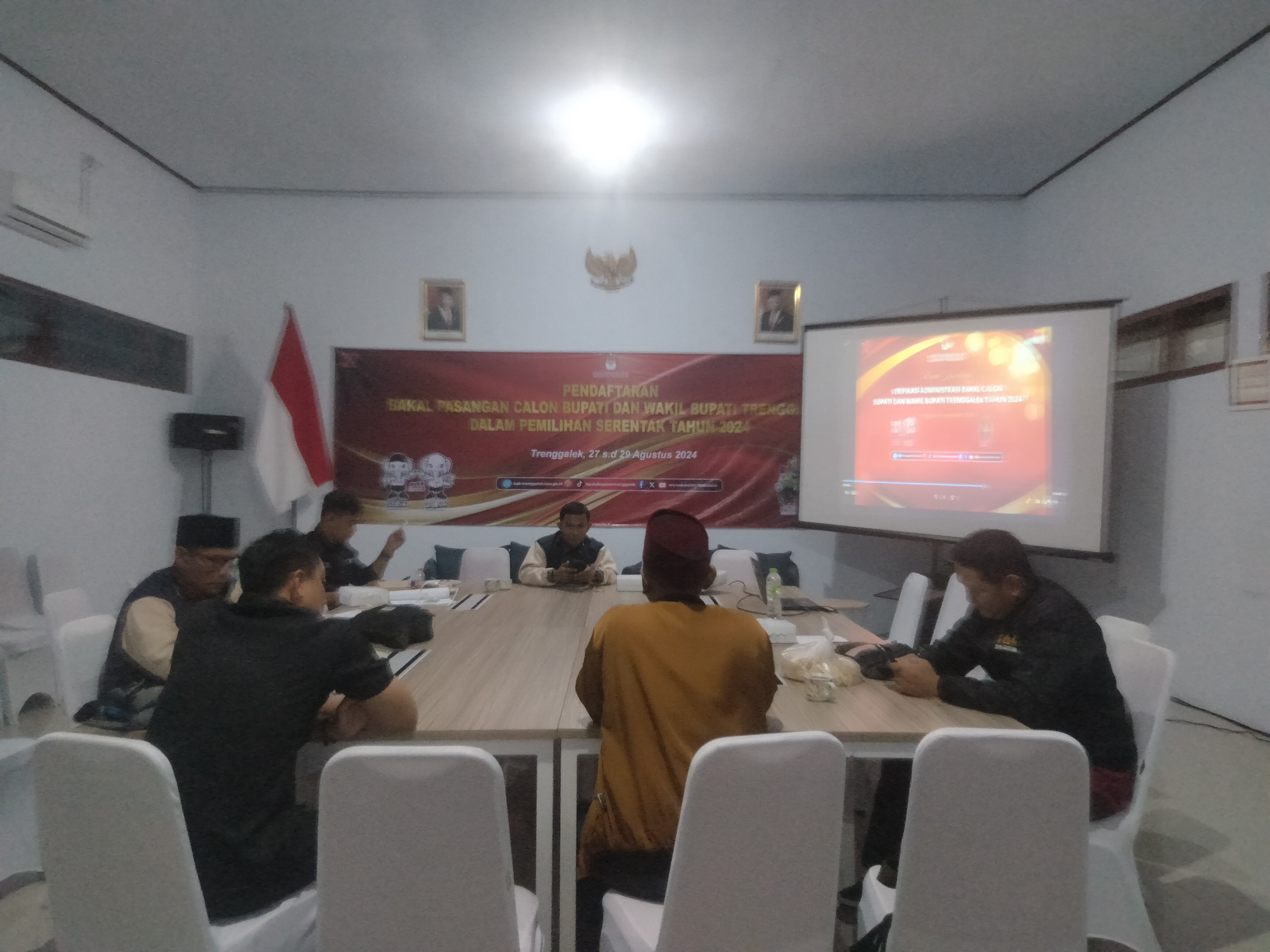 Hari ini, Rabu, tanggal 4 Agustus 2024, Komisi Pemilihan Umum Kabupaten Trenggalek menyelenggarakan Rapat Koordinasi Persiapan Verifikasi Administrasi Syarat Calon Bupati dan Wakil Bupati Trenggalek Tahun 2024. Kegiatan yang diselenggarakan di Kantor KPU Kabupaten Trenggalek tersebut dihadiri oleh empat orang Anggota KPU Kabupaten Trenggalek yaitu (1) Divisi Teknis Penyelenggaraan, (2) Divisi Sosialisasi, Pendidikan Pemilih, Partisipasi Masyarakat dan Sumber Daya Manusia (3) Divisi Hukum dan Pengawasan serta (4) Divisi Perencanaan, Data dan Informasi, beserta Sekretariat KPU Kabupaten Trenggalek, dan Anggota dan Staf Sekretariat Bawaslu Kabupaten Trenggalek. Kegiatan dimulai pukul 21.00 WIB dengan diawali penyampaian progres tahapan perpanjangan Pendaftaran Bakal Pasangan Calon Bupati dan Wakil Bupati Trenggalek Tahun 2024, dan persiapan verifikasi administrasi dokumen pencalonan dan syarat calon Bakal Calon Bupati dan Wakil Bupati Trenggalek Tahun 2024 yang disampaikan oleh Ali Sadad, Anggota KPU Kabupaten Trenggalek Divisi Teknis Penyelenggaraan. Ia menjelaskan bahwa hari ini, Rabu, tanggal 4 September 2024 merupakan hari terakhir perpanjangan kedua pendaftaran bakal pasangan calon Bupati dan Wakil Bupati Trenggalek Tahun 2024. Dari hasil pendaftaran bahwa terdapat satu bakal pasangan calon Bupati dan Wakil Bupati Trenggalek Tahun 2024 yang mendaftar ke KPU Kabupaten Trenggalek pada Rabu, tanggal 28 Agustus 2024 pukul 13.10 WIB yaitu bakal pasangan calon Mochamad Nur Arifin dan Syah Muhamad Nata Negara yang didukung delapan partai politik yaitu PDIP, PKB, Golkar, Gerindra, PKS, Hanura, PAN, dan Demokrat. Sebagaimana diketahui, Kang Sadad, panggilan akrabnya, menjelaskan bahwa 8 (delapan) partai politik yang mengusung dan mengusulkan bakal pasangan calon Mochamad Nur Arifin dan Syah Muhamad Nata Negara sebagai bakal calon Bupati dan Wakil Bupati dalam Pemilihan Bupati dan Wakil Bupati Trenggalek Tahun 2024 merupakan partai yang memiliki kursi di DPRD Kabupaten Trenggalek hasil Pemilu Tahun 2024 atau sebesar 433.342 suara sah hasil Pemilu Calon Anggota DPRD Kabupaten Trenggalek Tahun 2024. Sadad menjelaskan bahwa masih terdapat sisa suara sah Pemilu Calon Anggota DPRD Kabupaten Trenggalek Tahun 2024 dari partai politik yang tidak mendapatkan kursi di DPRD Kabupaten Trenggalek hasil Pemilu Tahun 2024 sebesar 24.671 suara sah. Namun jumlah sisa suara sah tersebut kurang dari syarat minimal 7,5% suara sah hasil Pemilu Calon Anggota DPRD Kabupaten Trenggalek Tahun 2024 atau sebesar 34.351 suara sah.