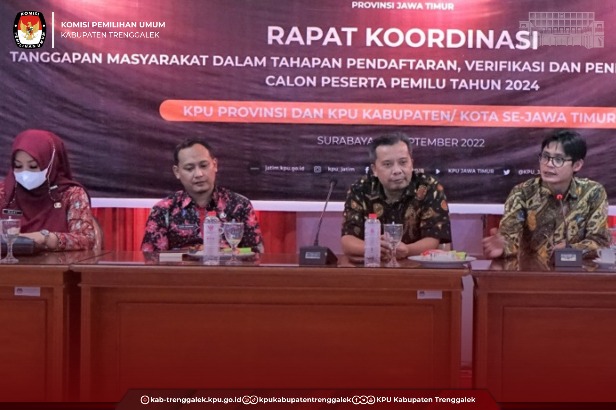 TRENGGALEK – Komisi Pemilihan Umum (KPU) Kabupaten Trenggalek memenuhi undangan Komisi Pemilihan Umum Provinsi Jawa Timur (KPU Jatim) yang menggelar Rapat koordinasi terkait dengan Tanggapan Masyarakat dalam Tahapan Pendaftaran, Verifikasi dan Penetapan Partai Politik (Parpol) Peserta Pemilu Tahun 2024. Acara diselenggarakan pada Sabtu, 3 September 2022, pukul 09.30-13.30 WIB. Rakor bertempat di aula lantai 2 kantor KPU Provinsi Jawa Timur, jalan Raya Tenggilis Nomor 1-3 Surabaya.