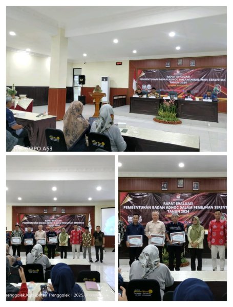 Hari ini, Jumat, tanggal 3 Januari 2025, Komisi Pemilihan Umum Kabupaten Trenggalek mengajak seluruh stakeholder untuk melakukan evaluasi tahapan Pembentukan Badan Adhoc Pemilihan Serentak Tahun 2024. Kegiatan yang diselenggarakan di Hall Rumah Makan Mekarsari Trenggalek tersebut dihadiri oleh Ketua, dan seluruh Anggota KPU Kabupaten Trenggalek, Sekretaris beserta jajaran Sekretariat KPU Kabupaten Trenggalek, Sekretaris Daerah Kabupaten Trenggalek, Bawaslu Kabupaten Trenggalek, Rutan II B Trenggalek, Bank Mandiri Kantor Cabang Trenggalek, BPJS Trenggalek, Cabang Dinas Pendidikan Trenggalek, dan OPD terkait. Acara dimulai pukul 13.00 WIB oleh MC diawali Menyanyikan Lagu Kebangsaan Indonesia Raya yang dipimpin oleh Dirigen. Acara dilanjutkan dengan Pembacaan Doa. Acara dibuka secara resmi oleh Ketua KPU Kabupaten Trenggalek, Istatiin Nafiah, pada pukul 14.15 WIB.