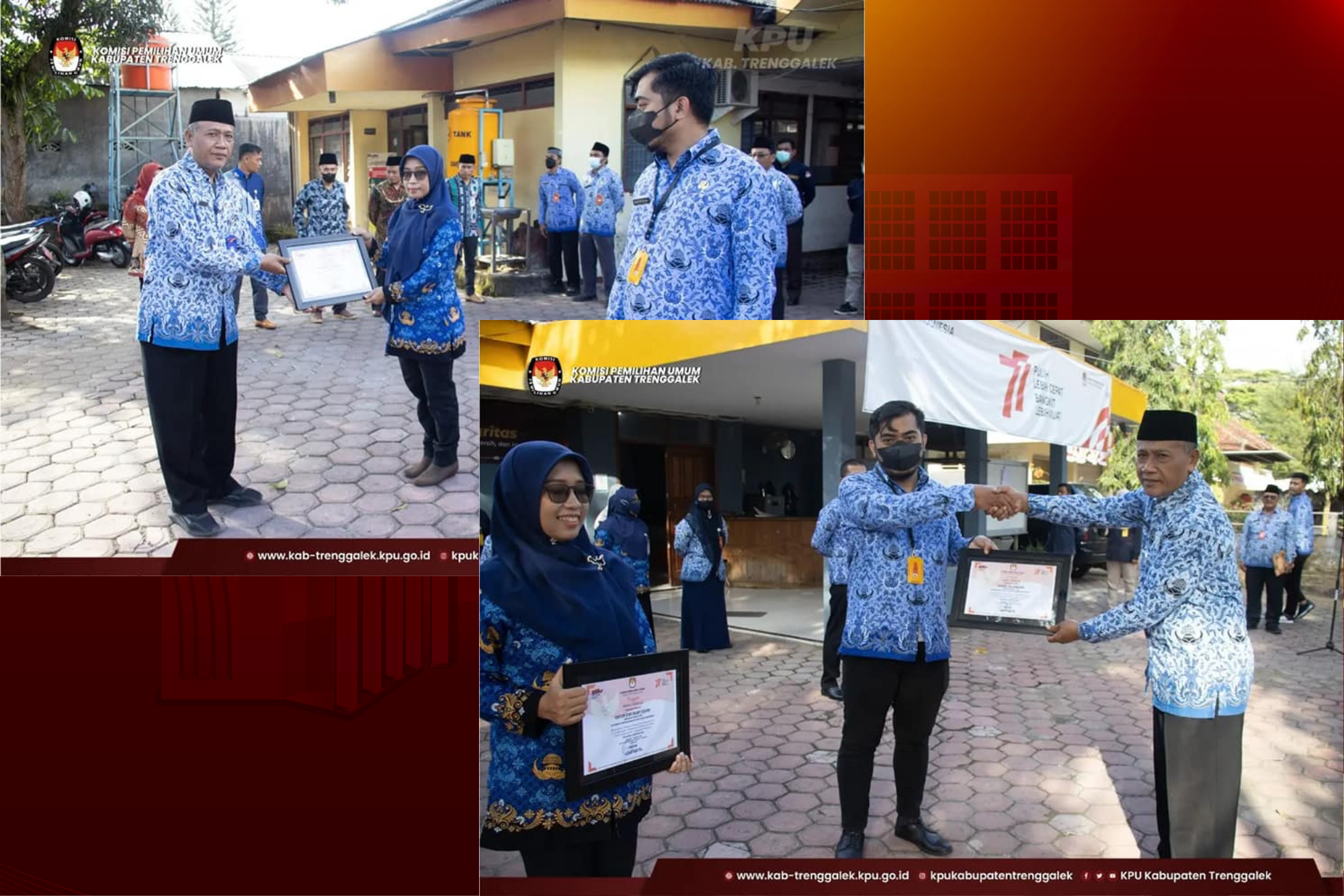 Penghargaan diberikan pada pukul 08.30 WIB oleh Sekretaris KPU Kabupaten Trenggalek kepada Yuyun Dwi Puspitasari, Kasubbag Perencanaan, data dan Informasi serta Agung Tri Laksana, Staf Subbag Teknis Penyelenggaraan Pemilu dan Hubungan Masyarakat. Selesai pemberian piagam penghargaan dilakukan foto bersama. (WR)