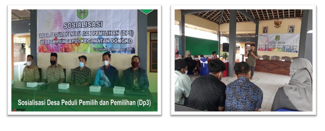 TRENGGALEK— Kegiatan Pendidikan Pemilih Desa Peduli Pemilu dan Pemilihan di Desa Pringapus, Kecamatan Dongko diselenggarakan di Balai Desa Pringapus Kecamatan Dongko, pada hari Senin, tanggal 6 Desember 2021, pukul 09.00 s.d. selesai WIB. Narasumber dalam kegiatan tersebut adalah Imam Nurhadi, Anggota KPU Kabupaten Trenggalek Divisi Hukum dan Pengawasan dan Nurani, Anggota KPU Kabupaten Trenggalek Divisi Sosialisasi, Pendidikan Pemilih, Partisipasi Masyarakat dan SDM.