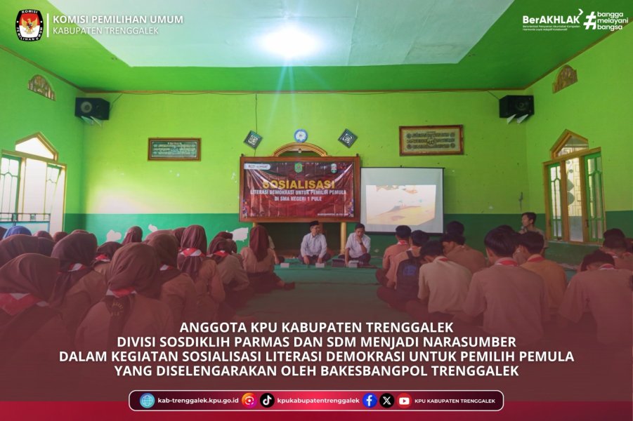 Hari ini, Jumat, tanggal 25 Juli 2025, Komisi Pemilihan Umum (KPU) Kabupaten Trenggalek bersama Bakesbangpol Kabupaten Trenggalek menyelenggarakan sosialisasi literasi demokrasi bagi pemilih pemula. Kegiatan tersebut diselenggarakan di Aula SMA Negeri 1 Pule. Bertindak sebagai narasumber kegiatan adalah Imam Nurhadi, Anggota KPU Kabupaten Trenggalek Ketua Divisi Sosialisasi, Pendidikan Pemilih, Partisipasi Masyarakat dan Sumber Daya Manusia, dan dimoderatori dan fasilitator Bakesbangpol Kabupaten Trenggalek. Kegiatan sosialisasi ini juga dihadiri oleh Komisi I DPRD Kabupaten Trenggalek. Kegiatan tersebut sangat bermanfaat bagi siswa-siswi SMA yang merupakan pemilih pemula. Kegiatan ini dihadiri oleh seluruh siswa SMA Negeri 1 Pule beserta guru dan Kepala Sekolah. Kegiatan dimulai pukul 09.00 WIB.