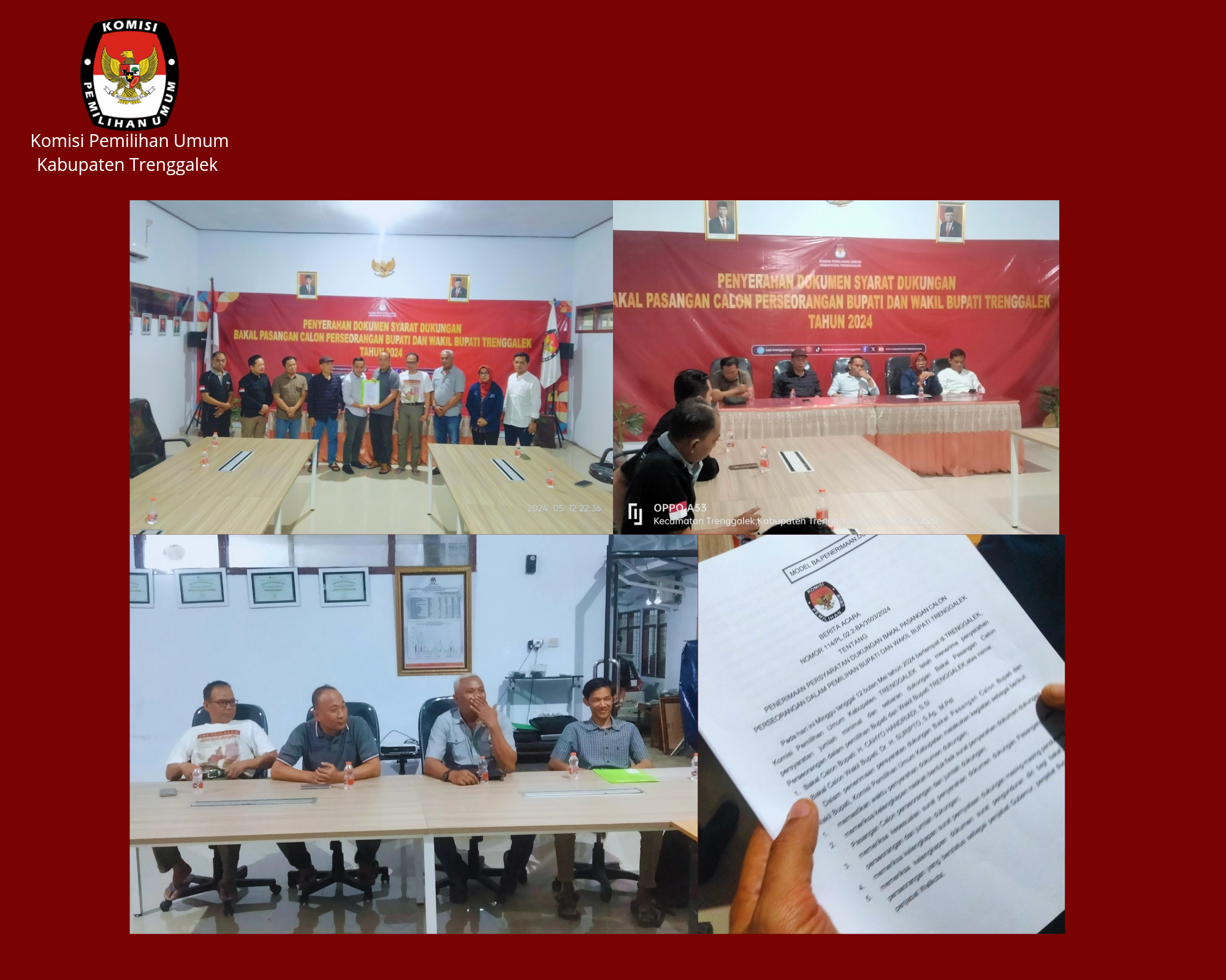Dari hasil pemeriksaan berkas persyaratan dukungan bakal pasangan calon perseorangan Bupati dan Wakil Bupati Trenggalek Tahun 2024 didapatkan hasil bahwa berkas dukungan persyaratan bakal pasangan calon tersebut lengkap dan diterima serta dapat melanjutkan ke tahapan verifikasi administrasi selanjutnya. Hal tersebut dituangkan dalam Berita Acara Nomor 114/PL.02.2-BA/3503/2024 tentang Penerimaan Persyaratan Dukungan Bakal calon Perseorangan dalam Pemilihan Bupati dan Wakil Bupati Trenggalek Tahun 2024.(Wro)