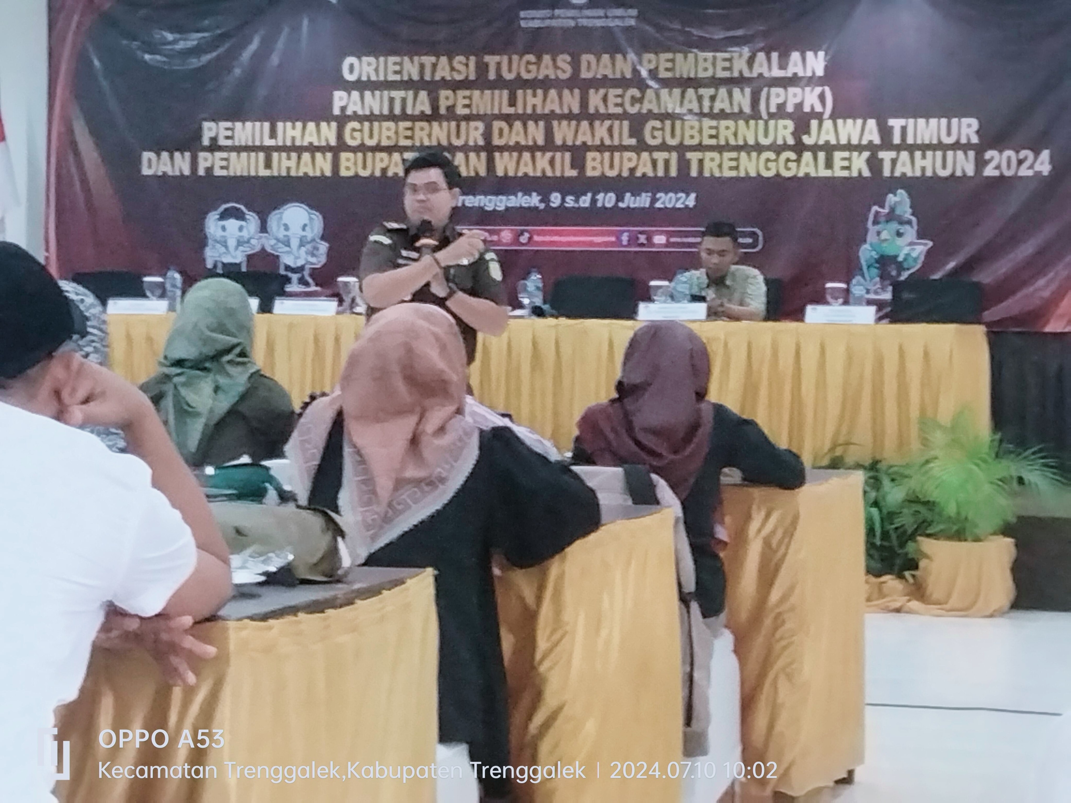 Hari ini, Rabu, tanggal 10 Juni 2024, merupakan hari kedua Orientasi Tugas dan Pembekalan Panitia Pemilihan Kecamatan (PPK) Pemilihan Serentak Tahun 2024. Bertempat di Hall Hotel Bukit Jaas Permai, seluruh Ketua dan Anggota serta Sekretariat PPK se-Kabupaten Trenggalek masih antusias mengikuti Orientasi Tugas dan Pembekalan tersebut.