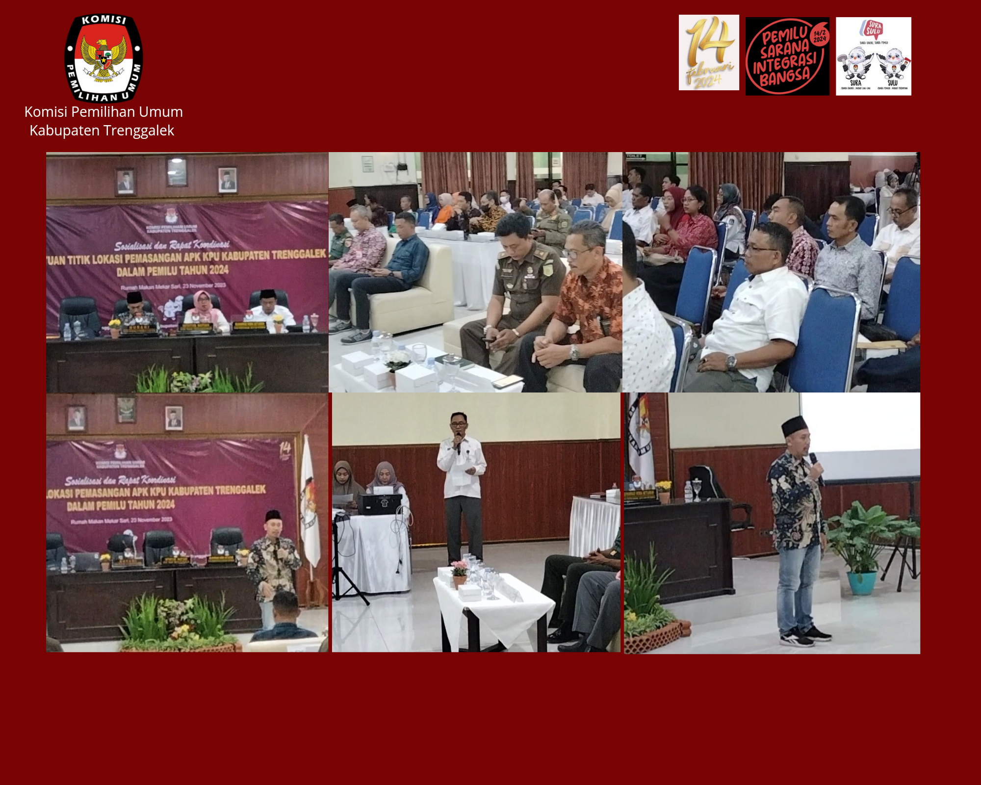 Hari ini, Kamis, 23 November 2023, Komisi Pemilihan Umum Kabupaten Trenggalek menyelenggarakan kegiatan Sosialisasi dan Rapat Koordinasi Penentuan Titik Lokasi Pemasangan Alat Peraga Kampanye Pemilu Tahun 2024. Kegiatan yang diselenggarakan di Hall Rumah Makan Mekarsari tersebut dihadiri oleh Forkopimda, seluruh KPU Kabupaten Trenggalek, OPD Kabupaten Trenggalek, perwakilan pengurus parpol tingkat Kabupaten Trenggalek, dan Bawaslu Kabupaten Trenggalek. Kegiatan dimulai pada pukul 14.00 oleh MC dengan diawali Menyanyikan Lagu Kebangsaan Indonesia Raya dan Jingle Pemilu Tahun 2024. Acara dilanjutkan dengan Pembacaan Doa yang dipimpin oleh Haji Misdiyanto, Kasubbag Teknis Penyelenggaraan Pemilu, Partisipasi dan Hubungan Masyarakat. Acara dibuka secara resmi pada pukul 14.30 WIB oleh Ketua KPU Kabupaten Trenggalek yang dalam kesempatan ini diwakili oleh Istatiin Nafiah, Anggota KPU Trenggalek Divisi Teknis Penyelenggaraan.