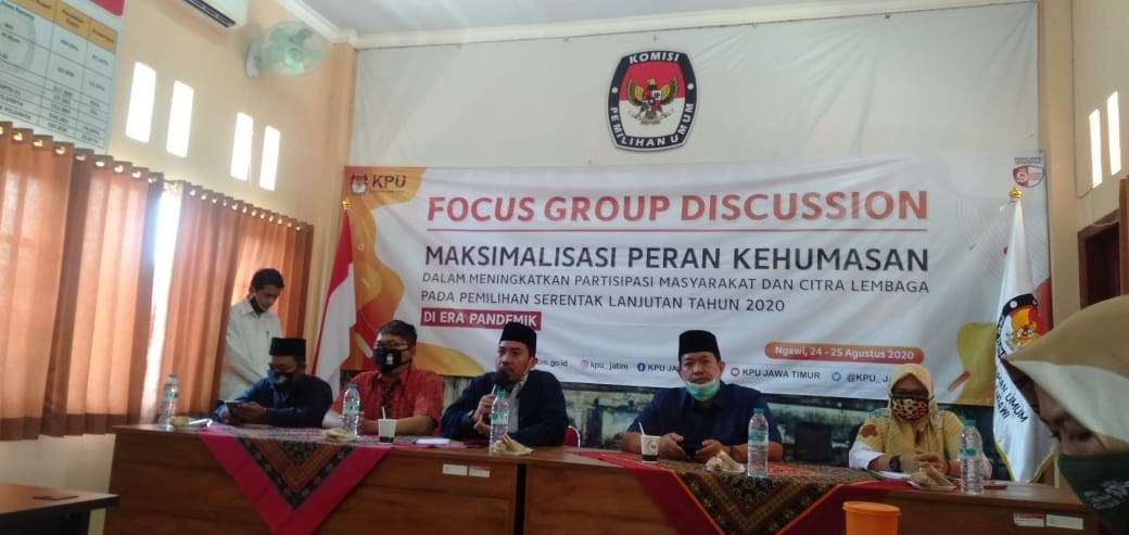 Kegiatan FGD dibuka sejak pukul 12.00 WIB oleh Miftakhur Rozak Komisioner KPU Jawa Timur yang mewakili Ketua KPU Jatim yang tidak bisa hadir. Lalu dilanjutkan dengan pengarahan dari Divisi Sosdiklih, Parmas, dan SDM dari KPU Provinsi Jatim Gogot Cahyo Baskoro. Lalu disuse bersama tentang bagaimana cara maksimalisasi Peran Kehumasan Dalam Meningkatkan Partisipasi Masyarakat dan Citra Lembaga Pada Pemilihan Serentak Lanjutan Tahun 2020 di Era Pandemik. [Woro]