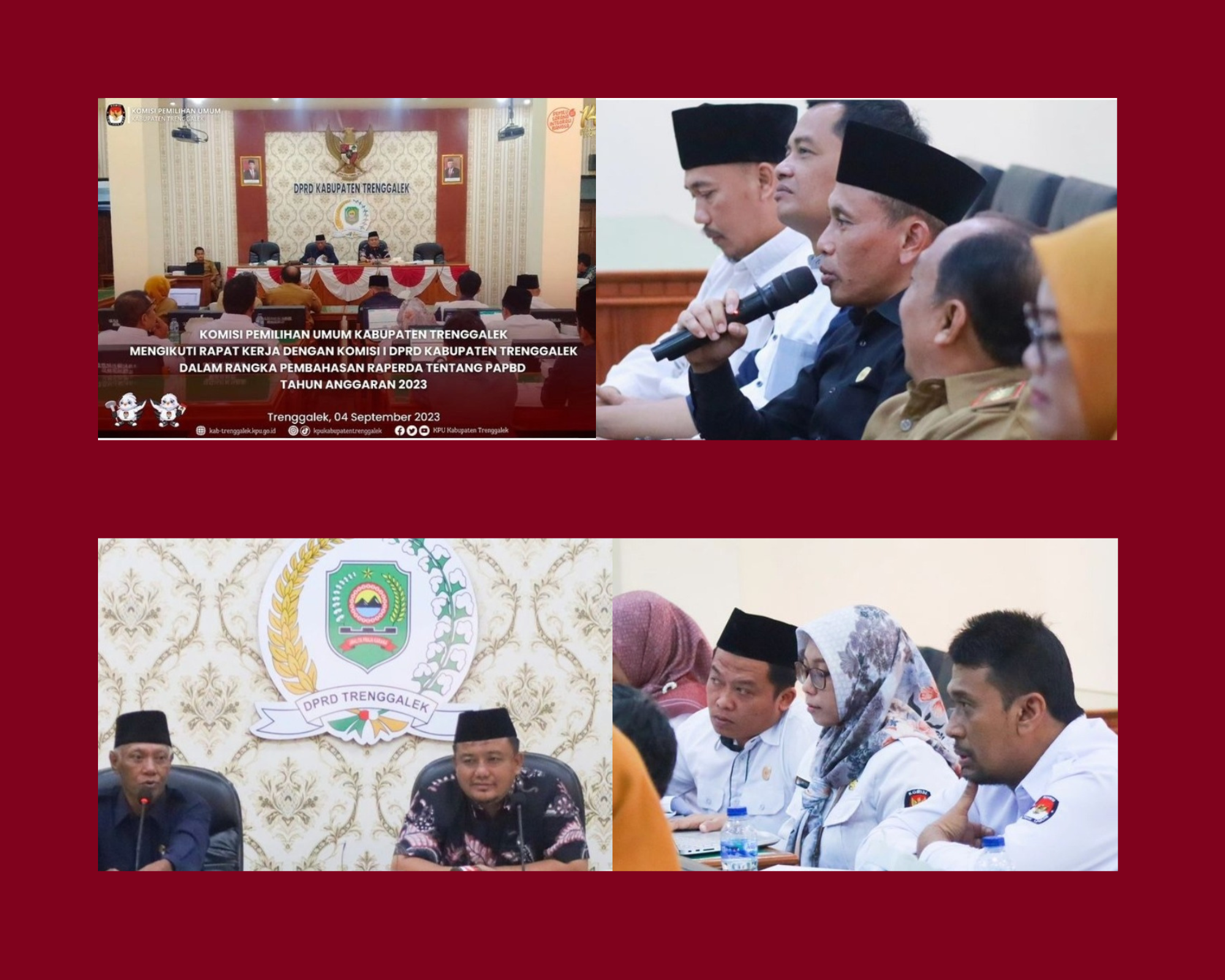 Hari ini, Senin, tanggal 4 September 2023, Komisi Pemilihan Umum Kabupaten Trenggalek mengikuti rapat kerja dengan Komisi I DPRD Kabupaten Trenggalek dalam rangka Pembahasan Raperda tentang Perubahan APBD Tahun Anggaran 2023 di Aula Kantor DPRD Kabupaten Trenggalek. Tim dari KPU Kabupaten Trenggalek terdiri atas Ketua, Anggota, Sekretaris dan Kasubbag KPU Kabupaten Trenggalek. Rapat tersebut dimulai pada pukul 09.00 WIB dipimpin langsung oleh Ketua dan Wakil Ketua Komisi I DPRD Kabupaten Trenggalek. Selain dari KPU Kabupaten Trenggalek, raker tersebut juga dihadiri oleh OPD terkait, salah satunya Bakesbangpol Trenggalek.