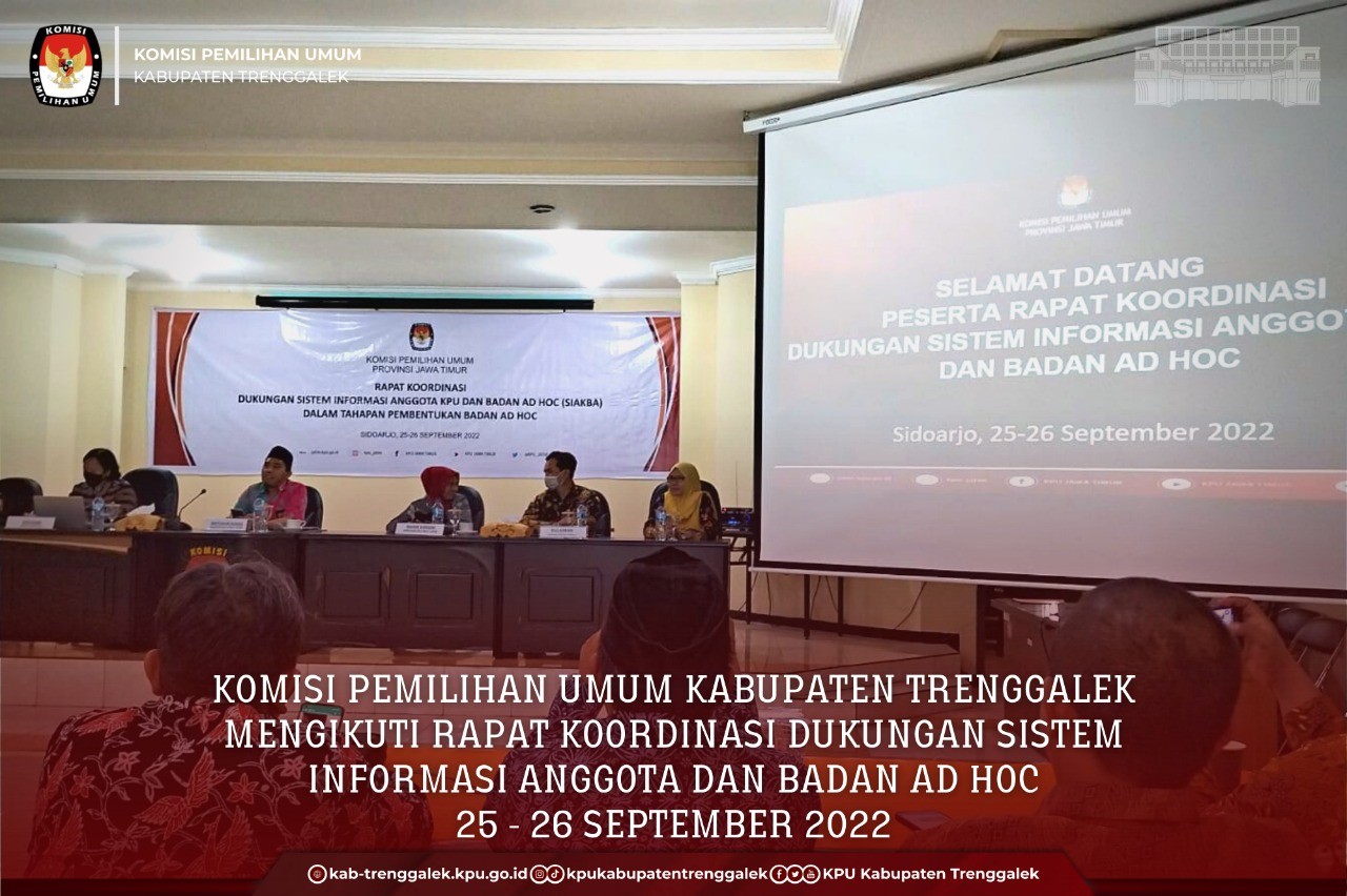TRENGGALEK— Saat ini Komisi Pemilihan Umum (KPU) tengah mengembangkan Sistem Informasi Anggota KPU dan Badan Ad Hoc (SIAKBA), yaitu sistem informasi untuk melakukan pendaftaran dan pendataan penyelenggara Pemilu baik KPu maupun tenaga adhoc. Oleh karena itu, untuk memperkenalkan sistem informasi itu, KPU Jawa Timur mengadakan acara rapat kordinasi Dukungan Sistem Informasi Anggota KPU dan Badan Ad Hoc (SIAKBA) Dalam Tahapan Pembentukan Badan Ad Hoc. Acara digelar para Hari Minggu-Senin, 25-26 September 2022.