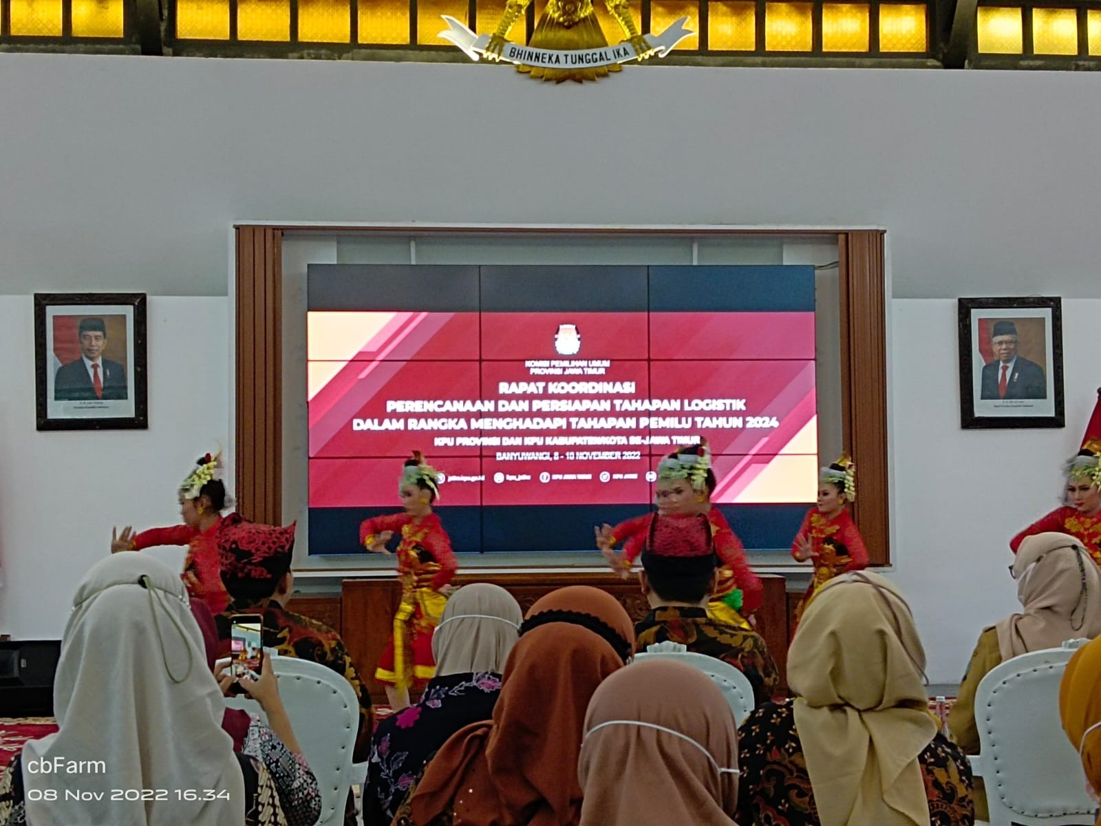Acara pembukaan dimeriahkan oleh sajian tari-tarian Gandrung Banyuwangi. Bupati Banyuwangi Ipuk Fiestiandani Azwar Anas menyambut dengan tangan terbuka pelaksaan kegiatan ini. Dalam sambutannya, ia menyampaikan pihaknya akan semaksimal mungkin fasilitasi untuk mendukung suksesnya Pemilu 2024. “Fasilitasi material dan non material akan dilakukan Pemkab Banyuwangi, termasuk mendukung pelaksanaan rakor KPU Provinsi Jatim yang diselenggarakan di Banyuwangi ini”, tegasnya.