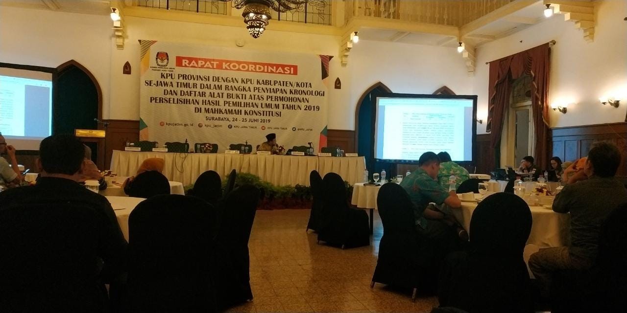 Untuk mempersiapkan sidang di Mahkamah Konstitusi (MK) terkait perselisihan hasil pemilu 2019, Komisi Pemilihan Umum (KPU) Propinsi Jawa Timur mengundang Divisi Hukum KPU Kabupaten/Kota se-Jawa Timur dalam acara Rapat Kordinasi. Acara dilaksanakan pada hari Senin-Selasa, tanggal 24-25 Juni 2019 di Hotel Majapahit Surabaya.