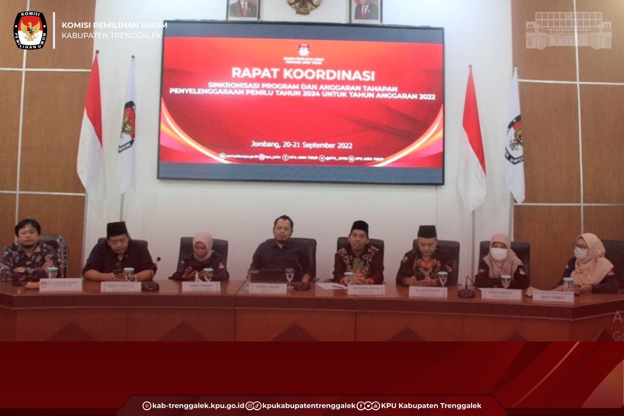 Tentunya KPU Kabupaten Trenggalek bersama KPU Kabupaten/Kota se-Jawa Timur juga hadir dalam kegiatan ini. Ketua KPU Kabupaten Trenggalek yang membidangi Divisi Keuangan, Umum, dan Logistik hadir bersama Sekretaris. Kegiatan rapat kordinasi digelar pada Selasa-Rabu, 20-21 September 2022 di Aula KPU Kabupaten Jombang, Jl. KH. Romli Tamim Kecamatan Jogoroto.