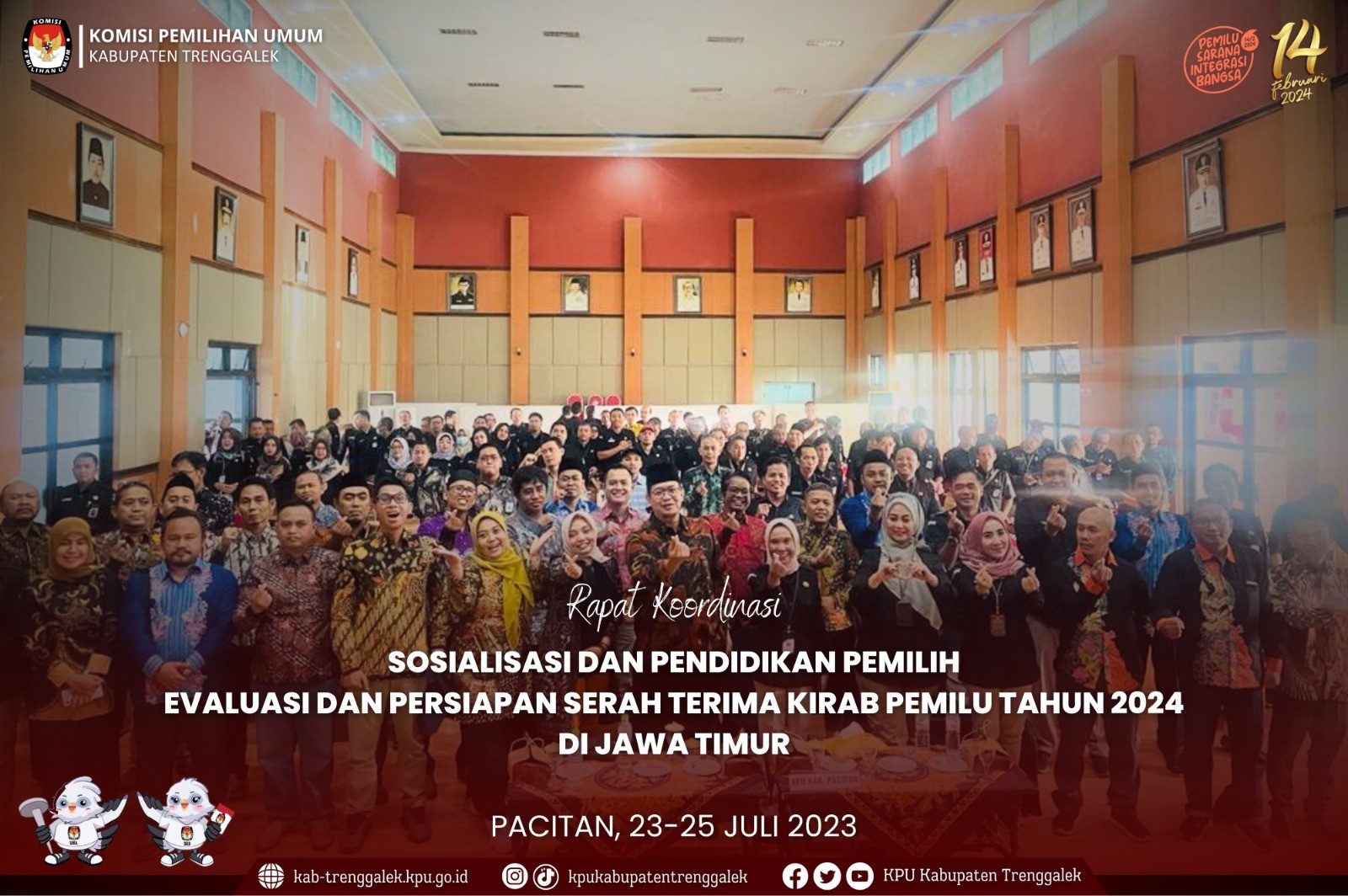 Dengan selesainya Kirab Pemilu 2024 di Jalur 4 Jawa Timur yang berakhir di Pacitan, Komisi Pemilihan Umum (KPU) Propinsi Jawa Timur menyelenggarakan rapat koordinasi dengan mengundang KPU Kabupaten/Kota se-Jawa Timur. Kegiatan dilaksanakan di aula Karya Dharma Kabupaten Pacitan, Minggu tanggal 23 Juli 2023. Hadir dari KPU Kabupaten Trenggalek komisioner KPU Divisi Sosialisasi-Pendidikan Pemilih, Partisipasi Masyarakat, dan Sumber Daya Manusia (SDM), sekretaris, dan Kasubag Teknis dan Hupmas.