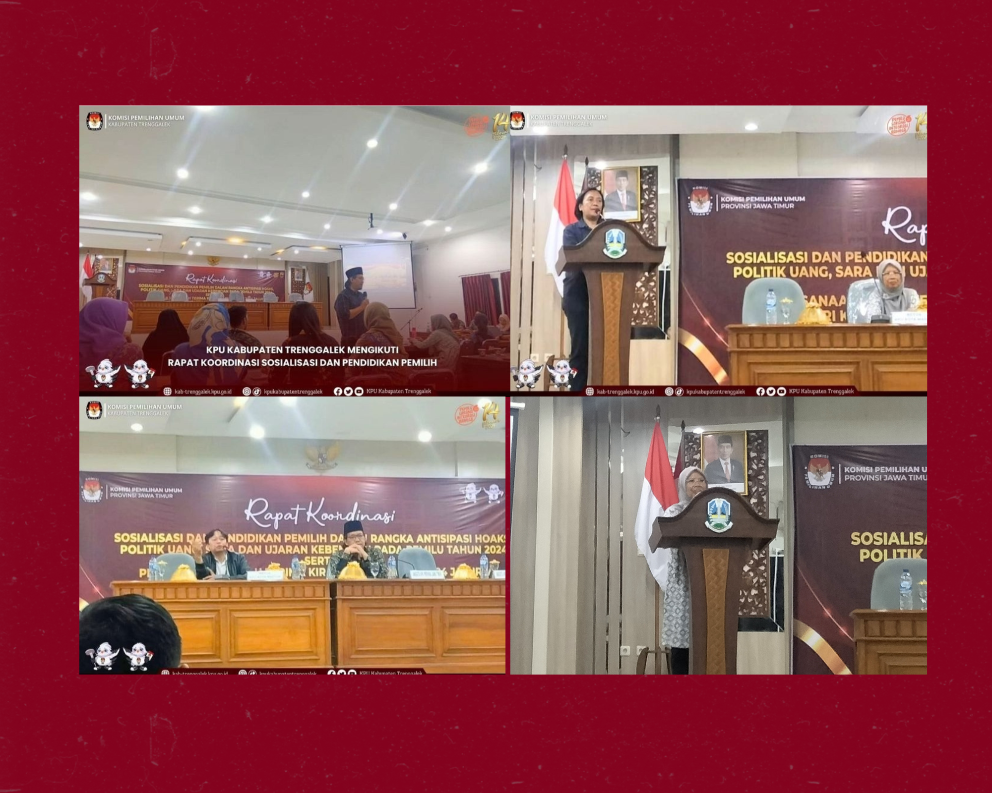 Hari Jumat sampai dengan Minggu, tanggal 6 sampai dengan 8 Oktober 2023, Komisi Pemilihan Umum Kabupaten Trenggalek menghadiri Rapat Koordinasi Sosialisasi dan Pendidikan Pemilih tentang Antisipasi Hoaks, Politik Uang, SARA dan Ujaran Kebencian yang diselenggarakan oleh KPU Provinsi Jawa Timur. Kegiatan yang diselenggarakan di Aula Bakorwil I Kota Madiun tersebut dihadiri oleh Anggota KPU Kabupaten/Kota Divisi Sosialisasi, Pendidikan Pemilih, Partisipasi Masyarakat dan Sumber Daya Manusia serta Kasubbag Teknis Penyelenggaraan Pemilu, Partisipasi, dan Hubungan Masyarakat atau Operator KPU Kabupaten/Kota se-Jawa Timur. Hadir dari KPU Kabupaten Trenggalek yaitu Nurani, Anggota KPU Kabupaten Trenggalek Divisi Sosialisasi, Pendidikan Pemilih, Partisipasi dan Hubungan Masyarakat serta Woro Wikan Maheswari, operator website dan media sosial KPU Kabupaten Trenggalek.