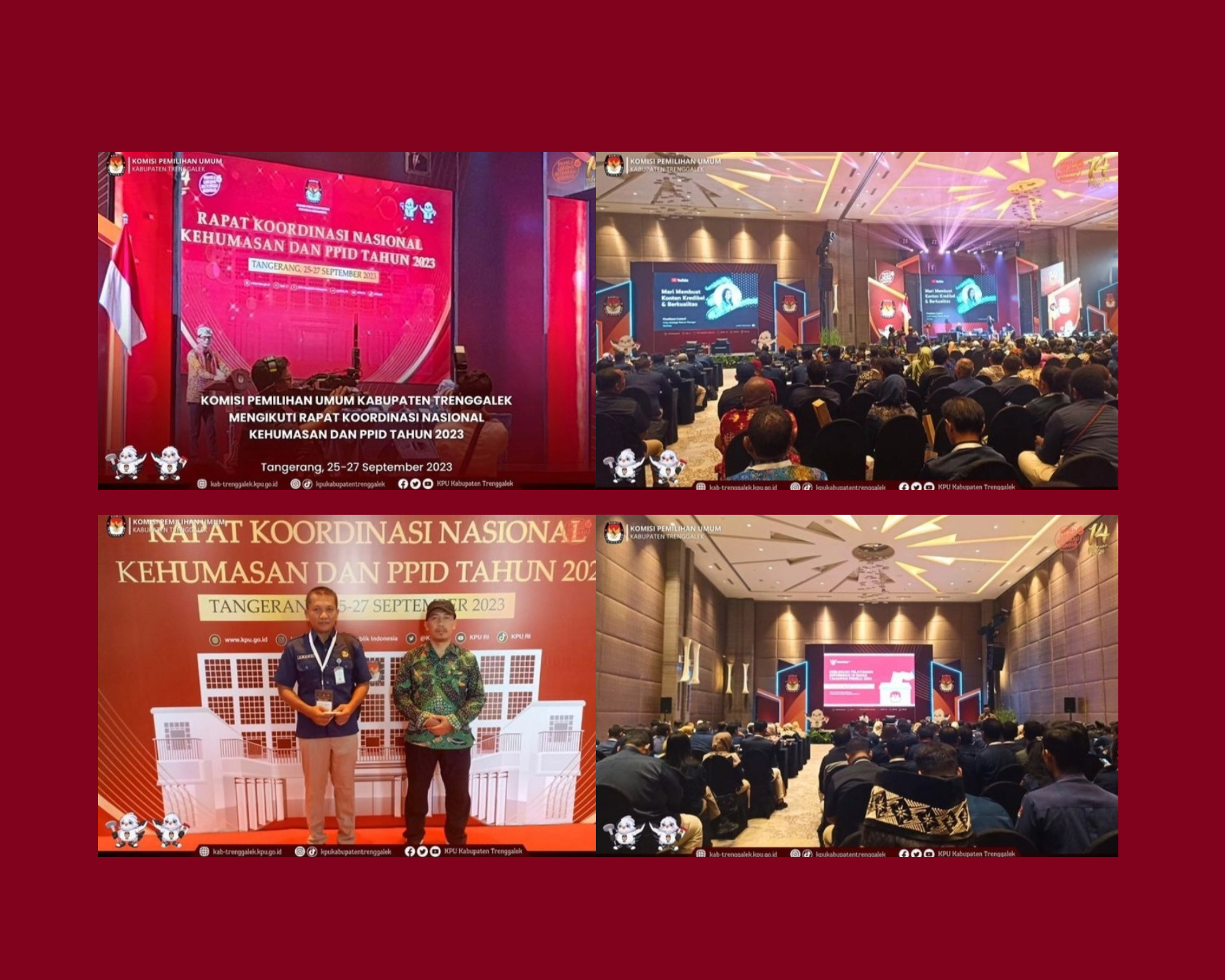 Mulai hari Senin, tanggal 25 September 2023 sampai hari Rabu tanggal 27 September 2023, Komisi Pemilihan Umum Kabupaten Trenggalek mengikuti Rapat Koordinasi Nasional (Rakornas) Kehumasan dan PPID Tahun 2023 yang diselenggarakan oleh Komisi Pemilihan Umum Republik Indonesia (KPU RI). Kegiatan tersebut diselenggarakan di Tangerang, Banten dan dihadiri oleh Pejabat PPID dan Anggota KPU Provinsi serta KPU Kabupaten/Kota Divisi Sosialisasi, Pendidikan Pemilih, Partisipasi Masyarakat dan Sumber Daya Manusia se-Indonesia.