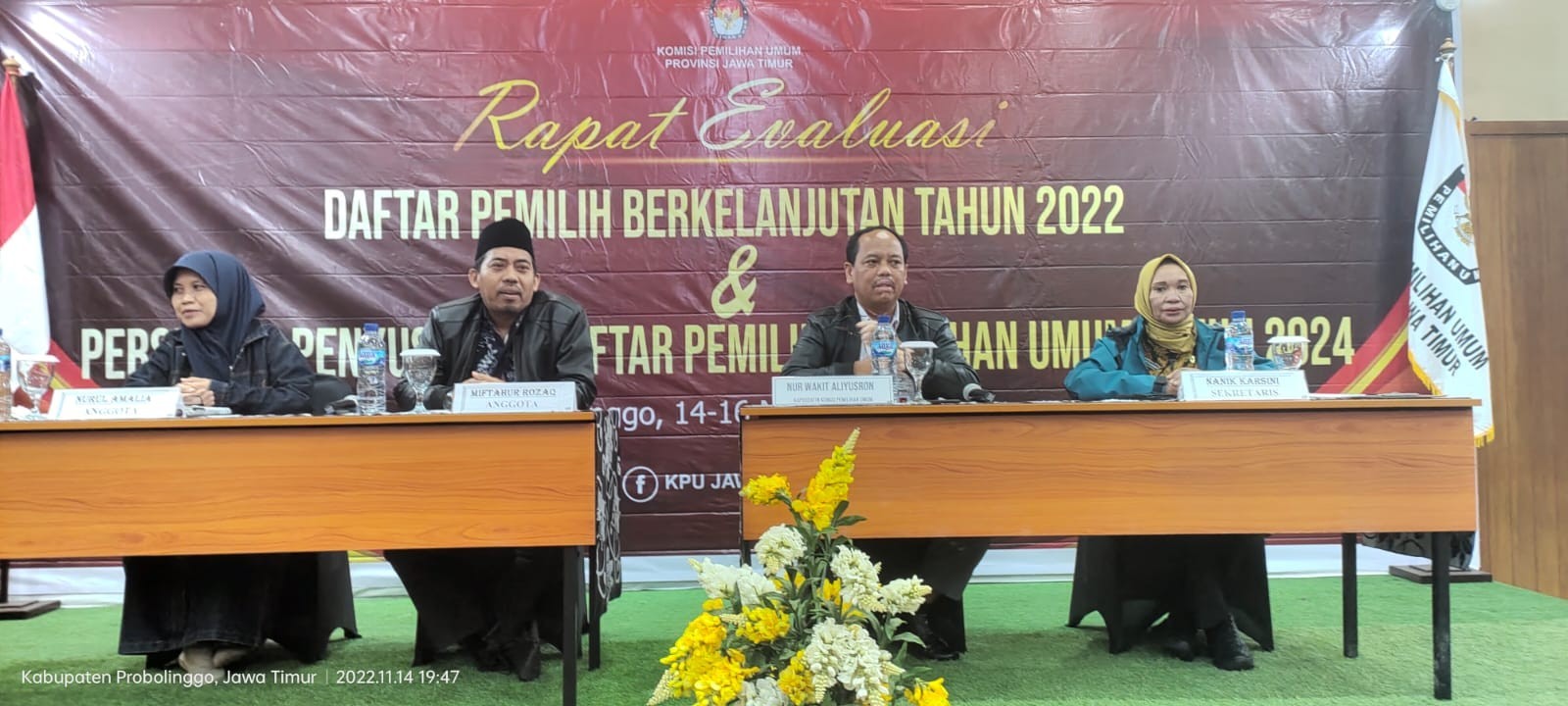 TRENGGALEK— Pada Hari Senin tanggal 14 November 2022, Komisi Pemilihan Umum (KPU) Kabupaten Trenggalek bersama KPU Kabupaten/Kota se-Jawa Timur menghadiri acara Rapat Evaluasi Daftar Pemilih Berkelanjutan Tahun 2022 dan Persiapan Penyusunan Daftar Pemilih Pemilihan Umum Tahun 2024. Hadir dalam rapat ini adalah Divisi Perencanaan, Data, dan Informasi, Kasubbag Rendatin, serta Operator Sidalih se-Jawa Timur. Kegiatan dilaksanakan di Lava View Lodge Hotel Probolinggo selama tiga hari.