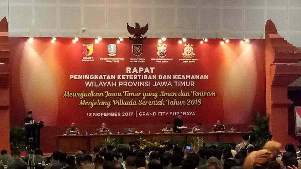 Dalam Rapat yang membahas keamanan dan ketenteraman Provinsi Jawa Timur menjelang pilkada serentak tahun 2018, semua pembicara sepakat menjadikan Jawa Timur aman tentram dan kondusif, agar tiga pilar (Pemerintah, TNI dan Polri) hingga Kades, Babunsa dan Babinkamtibmas bersatu padu menjadikan wilayah masing-masing kondusif dalam Pilkada serentak 2018. Sebisa mungkin penindakan hukum sebagai alternatif terakhir.