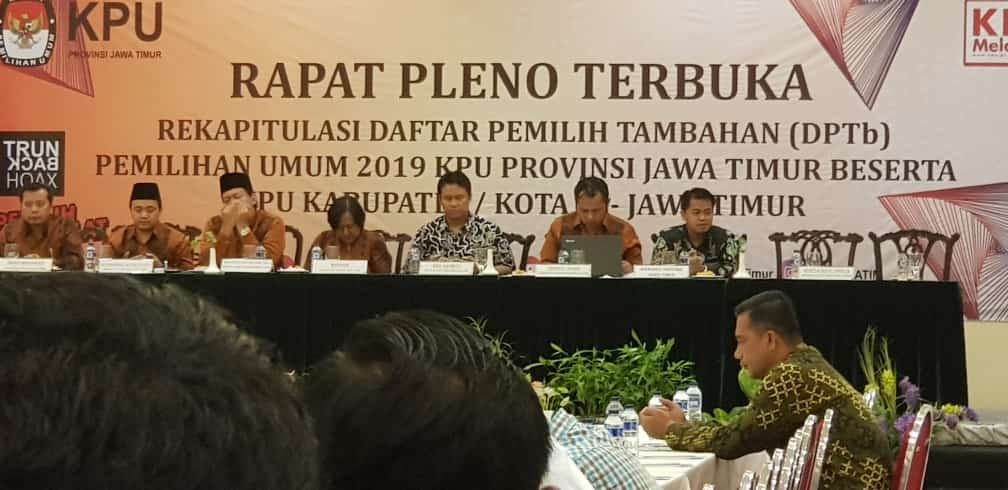 Ketua KPU Trenggalek Suripto dan Divisi Perencanaan dan Data Gembong Derita Hadi didampingi operator Sidalih Rudi Susanto hari ini Selasa, 17 Pebruari 2019 menghadiri Rapat Pleno Terbuka Rekapitulasi DPTb Pemilu 2019 tingkat Provinsi Jawa Timur.