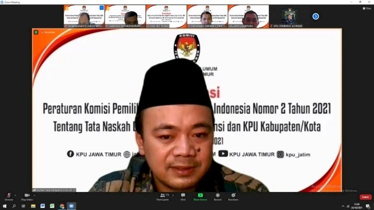 TRENGGALEK— Pada hari Kamis (28/10/2021), Komisi Pemilihan Umum (KPU) Kabupaten Trenggalek berpartisipasi hadir dalam kegiatan Sosialisasi Peraturan Komisi Pemilihan Umum Republik Indonesia Nomor 2 Tahun 2021 Tentang Tata Naskah Dinas KPU, KPU Provinsi dan KPU Kabupaten/Kota. Acara ini diselenggarakan oleh Komisi Pemilihan Umum Provinsi Jawa Timur (KPU Jatim) secara virtual melalui zoom meeting.