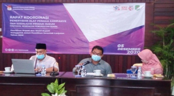 TRENGGALEK— Bersamaan dengan Rapat Koordinasi Penertiban Alat Peraga Kampanye Pemilihan Bupati dan Wakil Bupati Trenggalek dalam Pemilihan Serentak Lanjutan Tahun 2020, yang dilaksanakan pada hari Sabtu, tanggal 5 Desember 2020, pukul 08.30 s.d. 12.00 WIB bertempat di RM Mekarsari, KPU Kabupaten Trenggalek juga lakukan sosialisasi Protokol Kesehatan dalam Pemungutan Suara di TPS yang akan berlangsung empat hari lagi (9 Desember 2020).