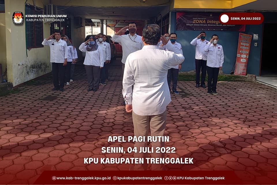 Kali ini yang menjadi inspektur upacara adalah Muhammad Indra Setiawan, komisioner KPU Kabupaten Trenggalek dengan komandan upacara dari staf di subagian Hukum dan SDM, Ichsanuadi. Bertempat di halaman KPU Kabupaten Trenggalek yang berada di pinggir jalan antar propinsi, tepat disamping timur kantor dinas Koperasi dan Perdagangan yang juga mengadakan Apel.