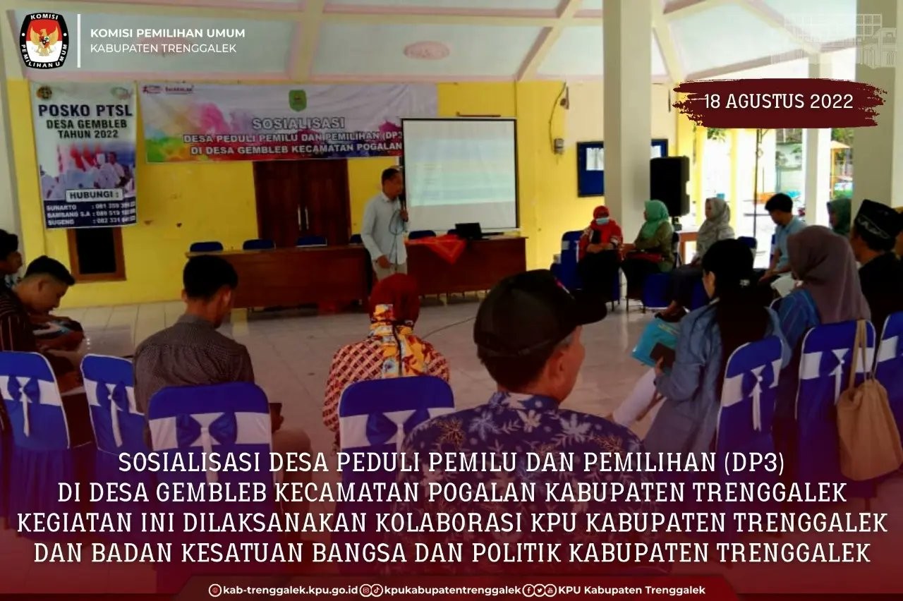 TRENGGALEK—Pada Hari Kamis (18/08/2022), Komisi Pemilihan Umum (KPU) Kabupaten Trenggalek bersama dengan Kantor Kesatuan Kebangsaan dan Politik (Kesbangpol) Kabupaten Trenggalek hadir di balai desa Gembleb Kecamatan Pogalan. Kehadiran ini dalam rangka melakukan pembentukan Kader Desa Peduli Pemilu dan Pemilihan (DP3) di desa tersebut.