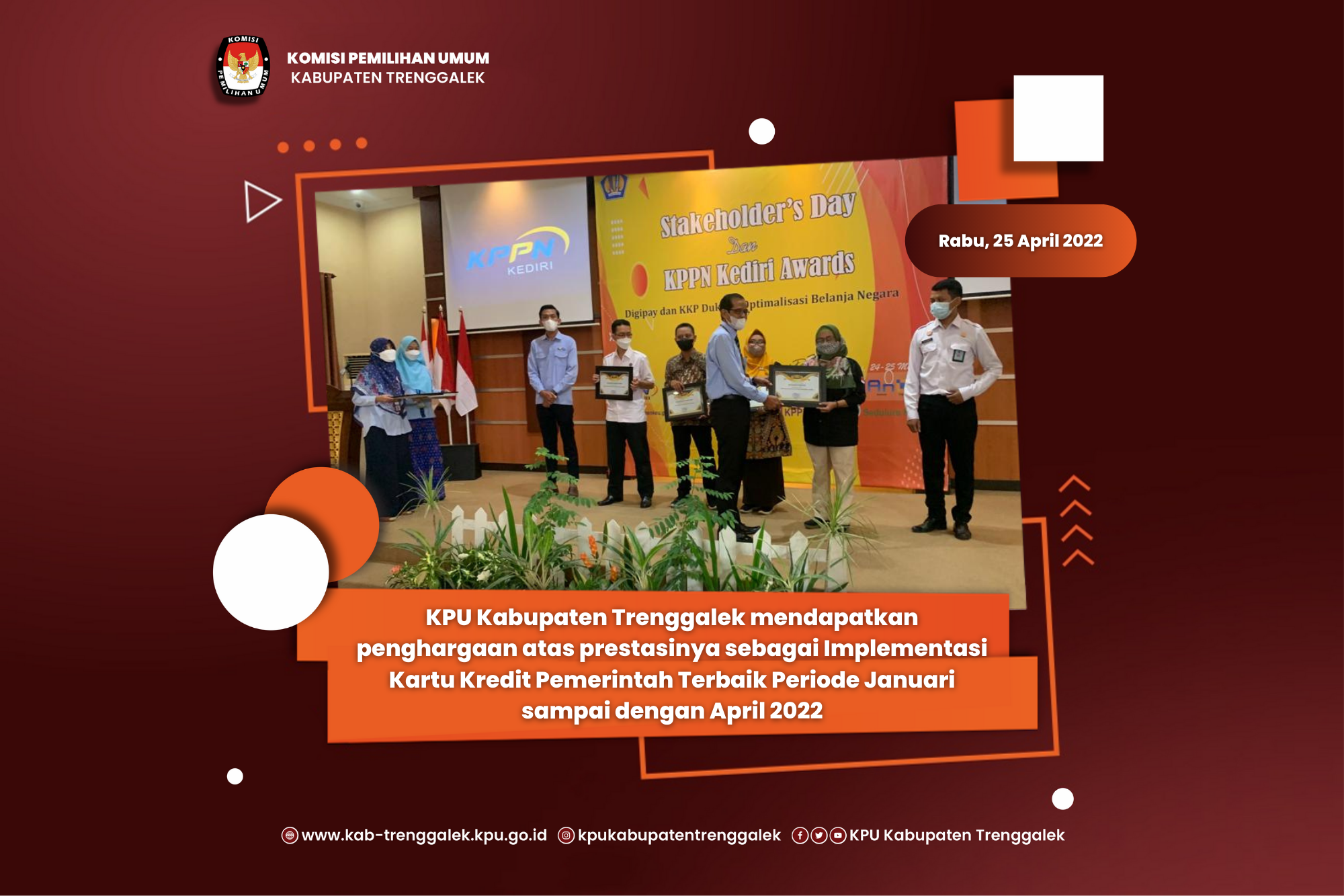 TRENGGALEK— Bertempat di Aula Kantor KPPN Kediri, hari ini, Rabu, tanggal 25 Mei 2022, KPU Kabupaten Trenggalek menerima penghargaan sebagai Lembaga Implementasi Kartu Kredit Pemerintah Terbaik Periode Januari sampai April 2022. Penghargaan tersebut diberikan kepada KPU Kabupaten Trenggalek atas prestasinya menerapkan secara konsisten (patuh) dalam penggunaan Kartu Kredit Pemerintah.