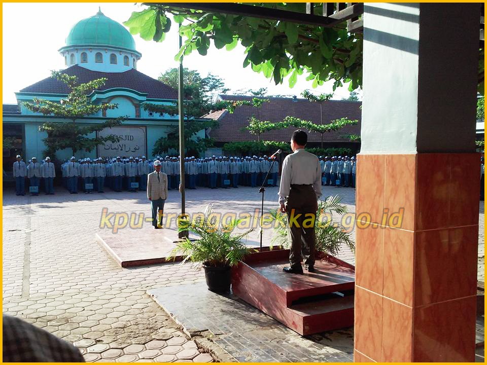 Dalam kesempatan kali ini Ketua KPU Kabupaten Trenggalek Suripto bertindak sebagai Pembina Upacara dalam upacara senin pagi di SMAN 1 Trenggalek. Dalam sambutannya beliau mengajak kepada seluruh siswa yang sudah memiliki hak pilih untuk menggunakan hak pilihnya pada Pemilihan Bupati dan Wakil Bupati Trenggalek yang akan digelar tanggal 9 Desember 2015 nanti.