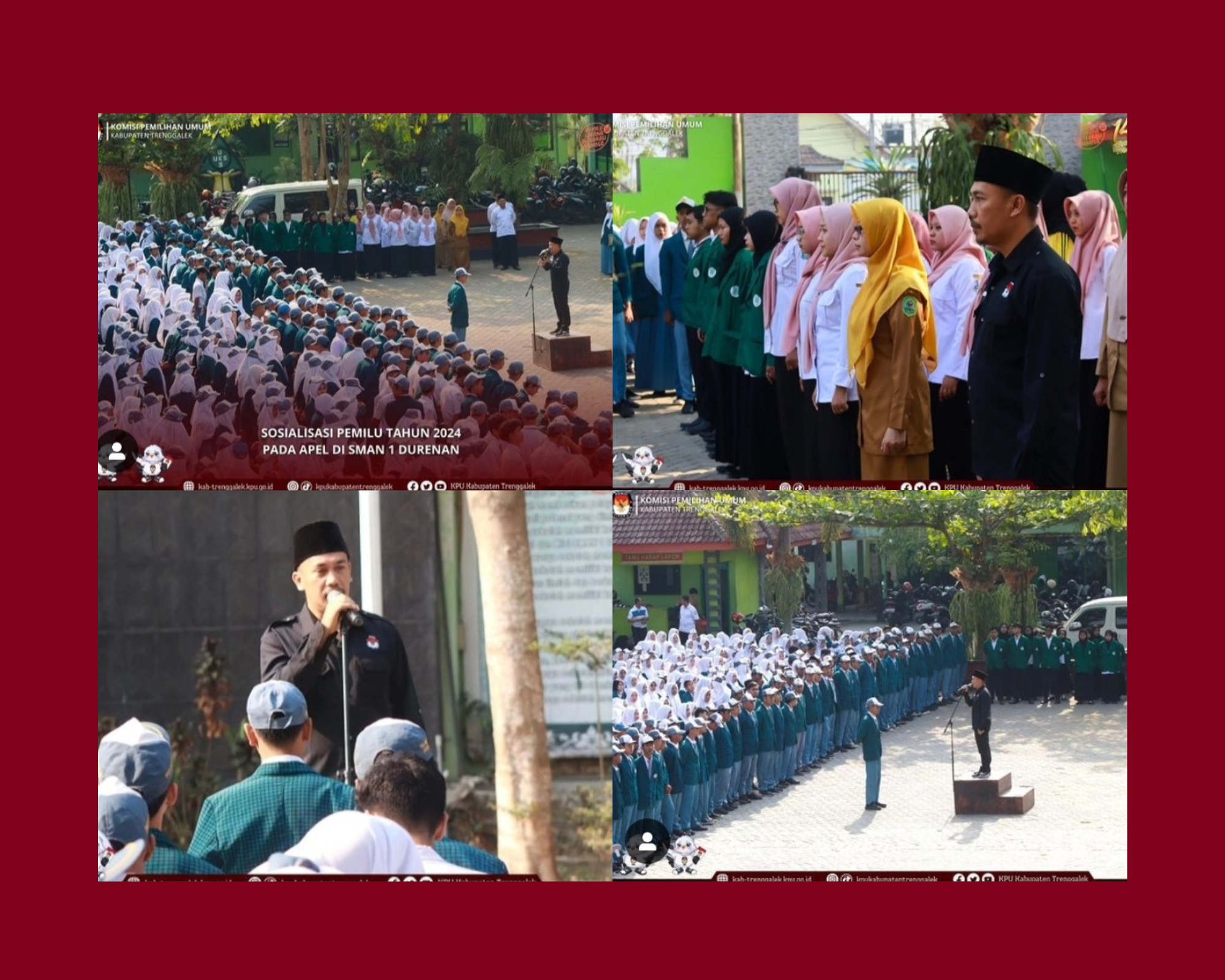 Hari ini, Senin, tanggal 23 Oktober 2023, Komisi Pemilihan Umum Kabupaten Trenggalek mendapat kehormatan untuk menjadi Pembina Upacara dalam Upacara Bendera Hari Senin di SMA Negeri 1 Durenan. Rombongan dari KPU Kabupaten Trenggalek terdiri dari Komisioner dan Sekretariat KPU Kabupaten Trenggalek. Upacara dimulai pada pukul 07.00 WIB.