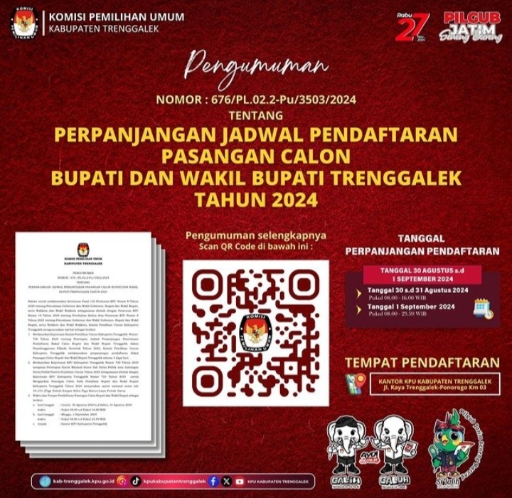 Hari ini, Kamis, 29 Agustus 2024, merupakan hari terakhir pendaftaran bakal pasangan calon Bupati dan Wakil Bupati Trenggalek Tahun 2024. Sampai dengan pukul 23.59 WIB, jumlah pendaftar masih 1 (satu) bakal pasangan calon yaitu Mochamad Nur Arifin -Syah Muhamad Nata Negara. “Masih satu Bakal pasangan calon Bupati dan Wakil Bupati Trenggalek Tahun 2024 yang mendaftar, Mochamad Nur Arifin dan Syah Muhamad Nata Negara, yang mendaftar ke KPU Kabupaten Trenggalek hari Rabu, tanggal 28 Agustus 2024 pukul 12.59 WIB”, jelas Istatiin, Ketua KPU Kabupaten Trenggalek, pada hari terakhir Pendaftaran Bakal Pasangan Calon Bupati dan Wakil Bupati Trenggalek Tahun 2024.