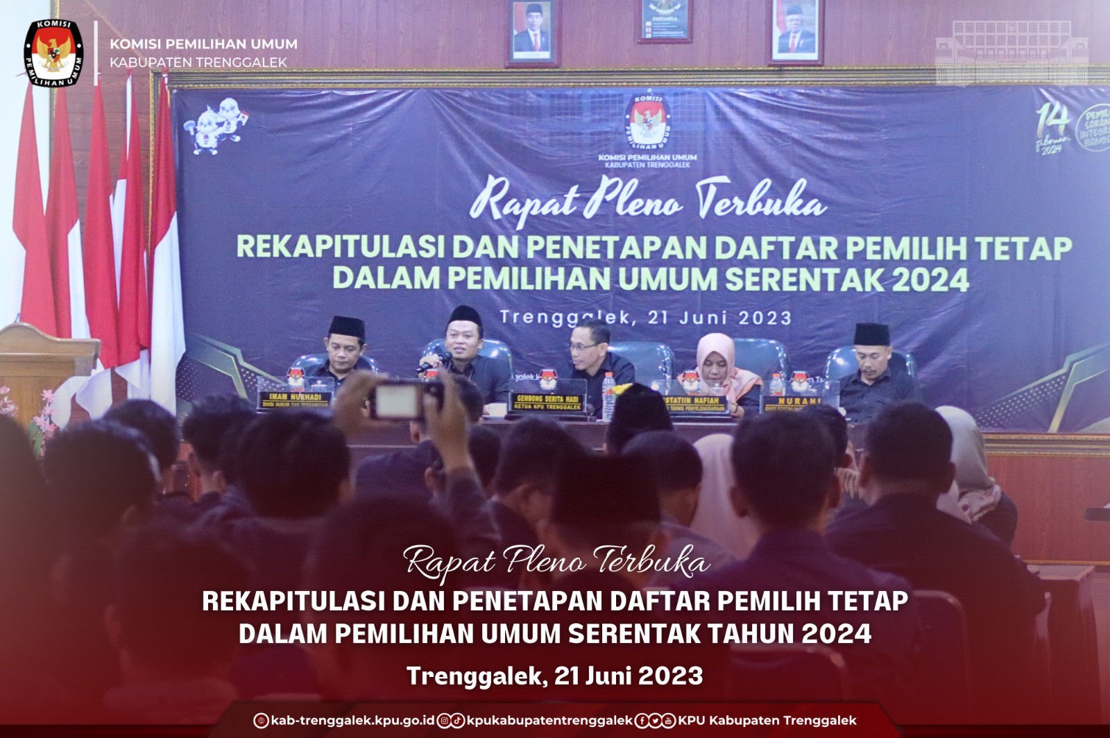 Sesuai jadwal dalam tahapan Pemutakhiran Data Pemilih dan Penyusunan Daftar Pemilih, Komisi Pemilihan Umum (KPU) Kabupaten Trenggalek menyelenggarakan Rapat Pleno Terbuka Rekapitulasi dan Penetapan Daftar Pemilih Tetap (DPT) Pemilihan Umum Tahun 2024 (Rabu, 21/06/2023). Kegiatan Rapat Pleno Terbuka ini diselenggarakan di Hall RM Mekarsari Trenggalek.