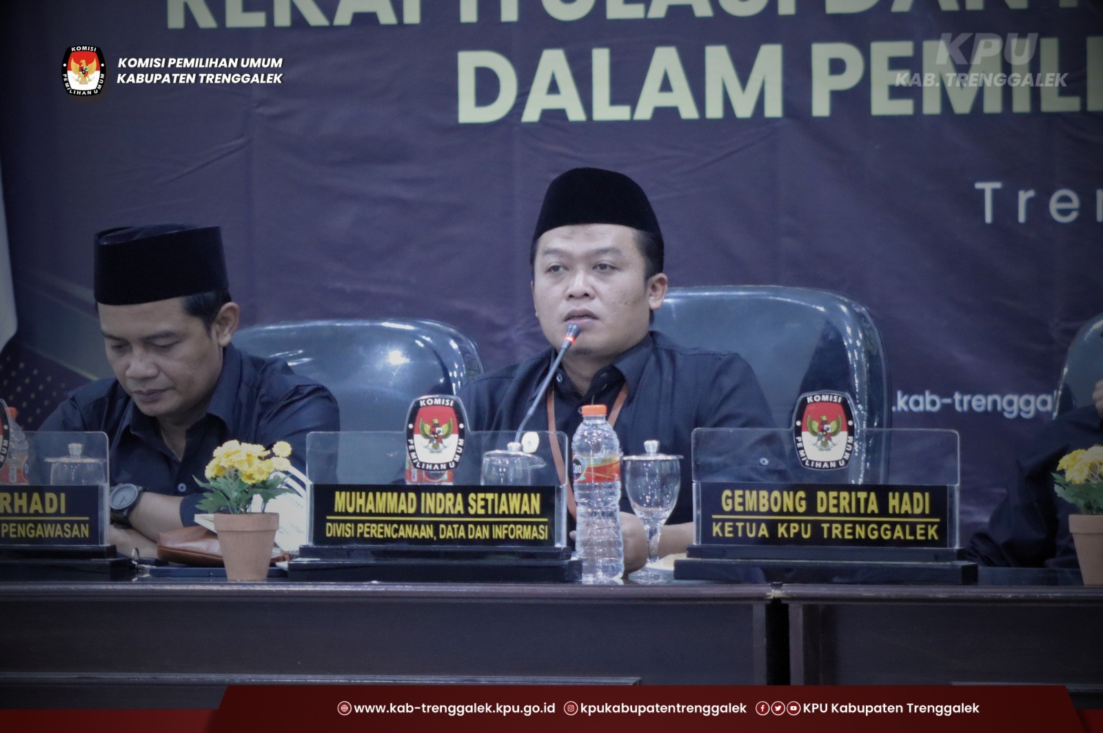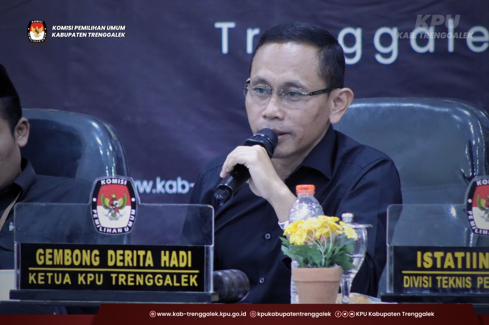 Gembong Derita Hadi Ketua KPU Kabupaten Trenggalek menyampaikan dalam sambutannya bahwa Rapat Pleno adalah forum pengambilan keputusan tertinggi termasuk penetapan DPT. Gembong mengapresiasi seluruh pihak yang hadir yang telah turut serta berkontribusi untuk mewujudkan DPT yang berkualitas.