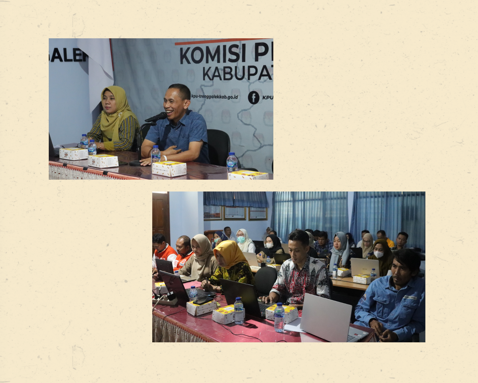 Hari ini, Kamis, tanggal 27 April 2023, Komisi Pemilihan Umum (KPU) Kabupaten Trenggalek menyelenggarakan Bimbingan Teknis Aplikasi Sistem Informasi Pencalonan (SILON) dalam Pemilu Anggota DPRD Kabupaten Trenggalek Tahun 2024. Kegiatan tersebut diikuti oleh seluruh operator dan LO partai politik peserta Pemilu Tahun 2024. Kegiatan yang diselenggarakan di Ruang Media Center KPU Kabupaten Trenggalek tersebut dimulai pada pukul 13.30 WIB dipandu oleh MC dan diawali Menyanyikan Lagu Kebangsaan Indonesia Raya dan dilanjutkan Doa. Acara dibuka secara resmi oleh Gembong Derita Hadi Ketua KPU Kabupaten Trenggalek pada pukul 14.00 WIB.