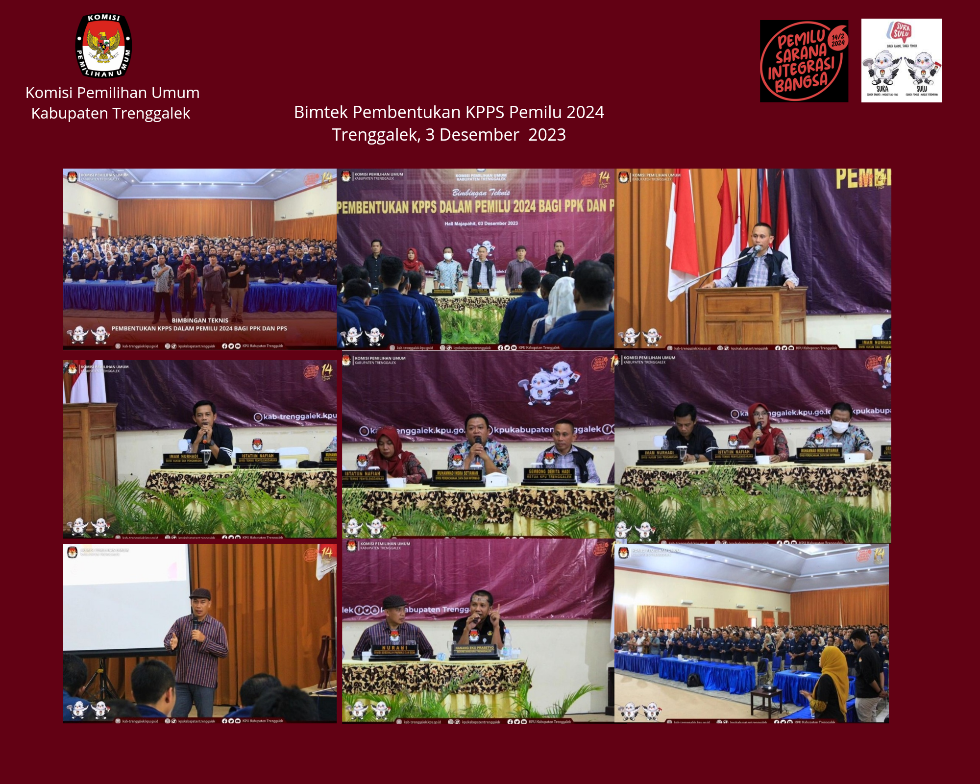 Hari ini, Minggu, 3 Desember 2023, Komisi Pemilihan Umum Kabupaten Trenggalek menyelenggarakan kegiatan Bimbingan Teknis Pembentukan Kelompok Penyelenggara Pemungutan Suara (KPPS) Pemilu 2024 bagi PPK dan PPS. Kegiatan yang diselenggarakan di Hall Majapahit Hotel Hayam Wuruk tersebut diikuti oleh Forkopimda, OPD Kabupaten Trenggalek terkait, Bawaslu Kabupaten Trenggalek, PPK, PPS, Sekretariat PPK dan Sekretariat PPS serta Tenaga Pendukung Sekretariat PPK dan PPS se-Kabupaten Trenggalek.