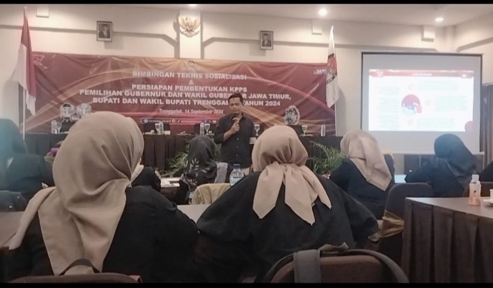Hari ini, Sabtu, 14 September 2024, KPU Kabupaten Trenggalek menyelenggarakan Bimbingan Teknis Sosialisasi dan Persiapan Pembentukan KPPS Pemilihan Gubernur dan Wakil Gubernur Jawa Timur serta Pemilihan Bupati dan Wakil Bupati Trenggalek Tahun 2024. Kegiatan yang diselenggarakan di Hall Hotel Bukit Jaas Permai tersebut dihadiri oleh Ketua dan tiga orang Anggota KPU Kabupaten Trenggalek yaitu (1) Anggota KPU Kabupaten Trenggalek Divisi Sosialisasi, Pendidikan Pemilih, Partisipasi Masyarakat dan Sumber Daya Manusia, (2) Anggota KPU Kabupaten Trenggalek Divisi Hukum dan Pengawasan, dan (3) Anggota KPU Kabupaten Trenggalek Divisii Teknis Penyelenggaraan, Sekretaris beserta jajaran Sekretariat KPU Kabupaten Trenggalek, Bakesbangpol Trenggalek, dan dua orang Anggota PPK se-Kabupaten Trenggalek yaitu (1) Anggota PPK yang membidangi Sosialisasi, Pendidikan Pemilih, Partisipasi Masyarakat dan Sumber Daya Manusia serta (2) Anggota PPK yang membidangi Teknis Penyelenggaraan serta Nurani, narasumber yang juga pegiat literasi dan Anggota KPU Kabupaten Trenggalek Periode 2014-2019 dan 2019-2024.