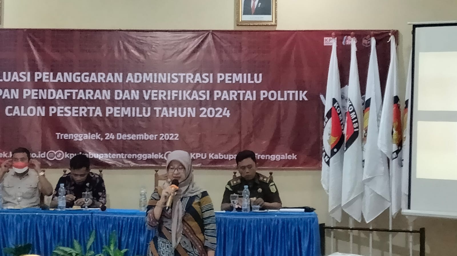 TRENGGALEK— Hari ini, Sabtu, tanggal 24 Desember 2022, bertempat di Hall Hotel Hayam Wuruk, Komisi Pemilihan Umum (KPU) Kabupaten Trenggalek menyelenggarakan acara Evaluasi Pelanggaran Administrasi pada tahapan Verifikasi Partai Politik Calon Peerta Pemilu Tahun 2024. Acara tersebut dihadiri oleh seluruh perwakilan partai politik tingkat Kabupaten Trenggalek, Bawaslu Kabupaten Trenggalek, Kepolisian Resort , Bakesbangpol Trenggalek dan Kejaksaan Negeri Trenggalek.