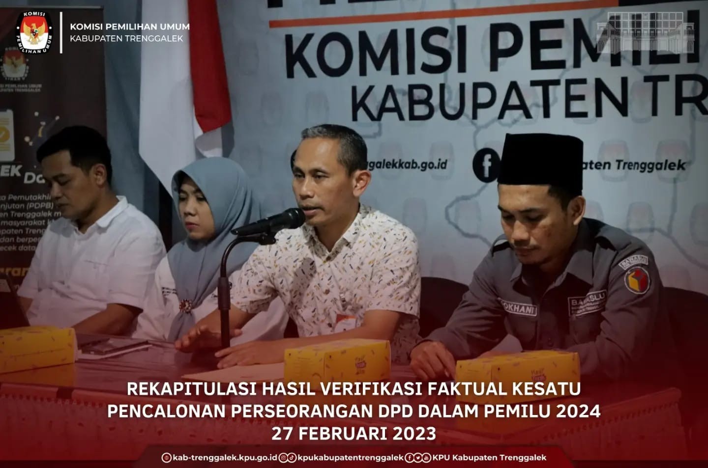 TRENGGALEK— Hari ini, Senin, 27 Februari 2023, Komisi Pemilihan Umum (KPU) Kabupaten Trenggalek menyelenggarakan Rapat Pleno Terbuka Rekapitulasi Hasil Verifikasi Faktual Kesatu Berkas Dukungan Calon Anggota DPD RI Pemilu Tahun 2024 Tingkat Kabupaten. Kegiatan tersebut bertempat di Ruang Media Center KPU Kabupaten Trenggalek yang dihadiri oleh LO Bakal Calon Anggota DPD RI, Bawaslu RI, jajaran Sekretariat KPU Kabupaten Trenggalek dan dipimpin oleh Ketua dan Anggota KPU Kabupaten Trenggalek. Dalam kegiatan tersebut dilakukan rekapitulasi hasil verifikasi faktual kesatu berkas dukungan calon anggota DPD RI Pemilu Tahun 2024. Adapun kegiatan Verifikasi Faktual Kesatu Berkas Dukungan Calon Anggota DPD RI Pemilu Tahun 2024 dilaksanakan sejak tanggal 13 s.d. 26 Februari 2023.
