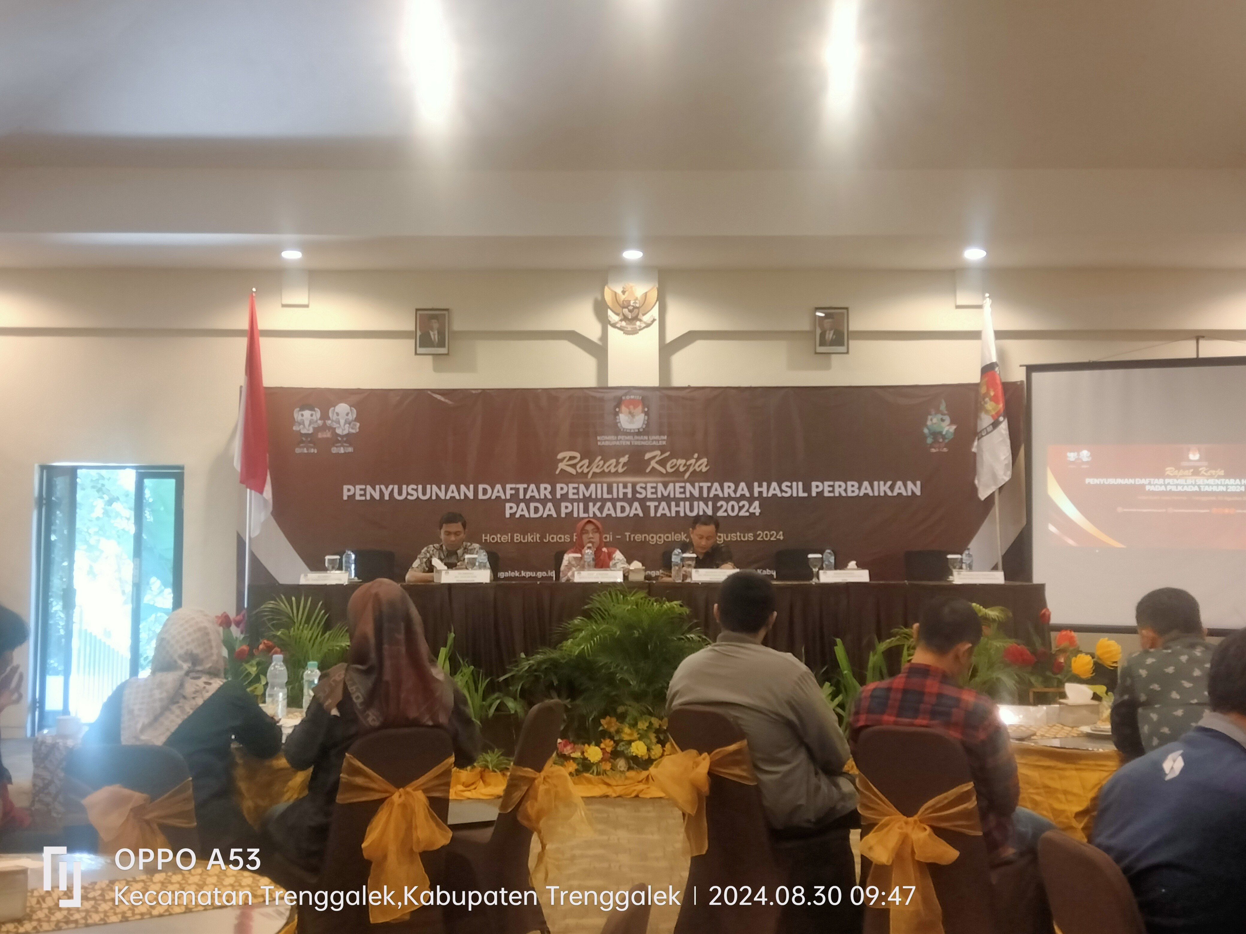 Hari ini, Jumat tanggal 30 Agustus 2024, Komisi Pemilihan Umum Kabupaten Trenggalek menyelenggarakan Rapat Kerja Penyusunan Daftar Pemilih Sementara Hasil Perbaikan pada Pemilihan Gubernur dan Wakil Gubernur Jawa Timur serta Pemilihan Bupati dan Wakil Bupati Trenggalek Tahun 2024. Kegiatan yang diselenggarakan di Hall Hotel Bukit Jaas Permai tersebut dihadiri oleh Ketua dan dua orang Anggota KPU Kabupaten Trenggalek yaitu Divisi Hukum dan Pengawasan, serta Divisi Perencanaan, Data dan Informasi, Sekretaris beserta jajaran Sekretariat KPU Kabupaten Trenggalek, Bawaslu Kabupaten Trenggalek, Dispendukcapil Trenggalek, Rutan Kelas II B Trenggalek, Ketua dan Anggota PPK yang membidangi Data dan Informasi se-Kabupaten Trenggalek.