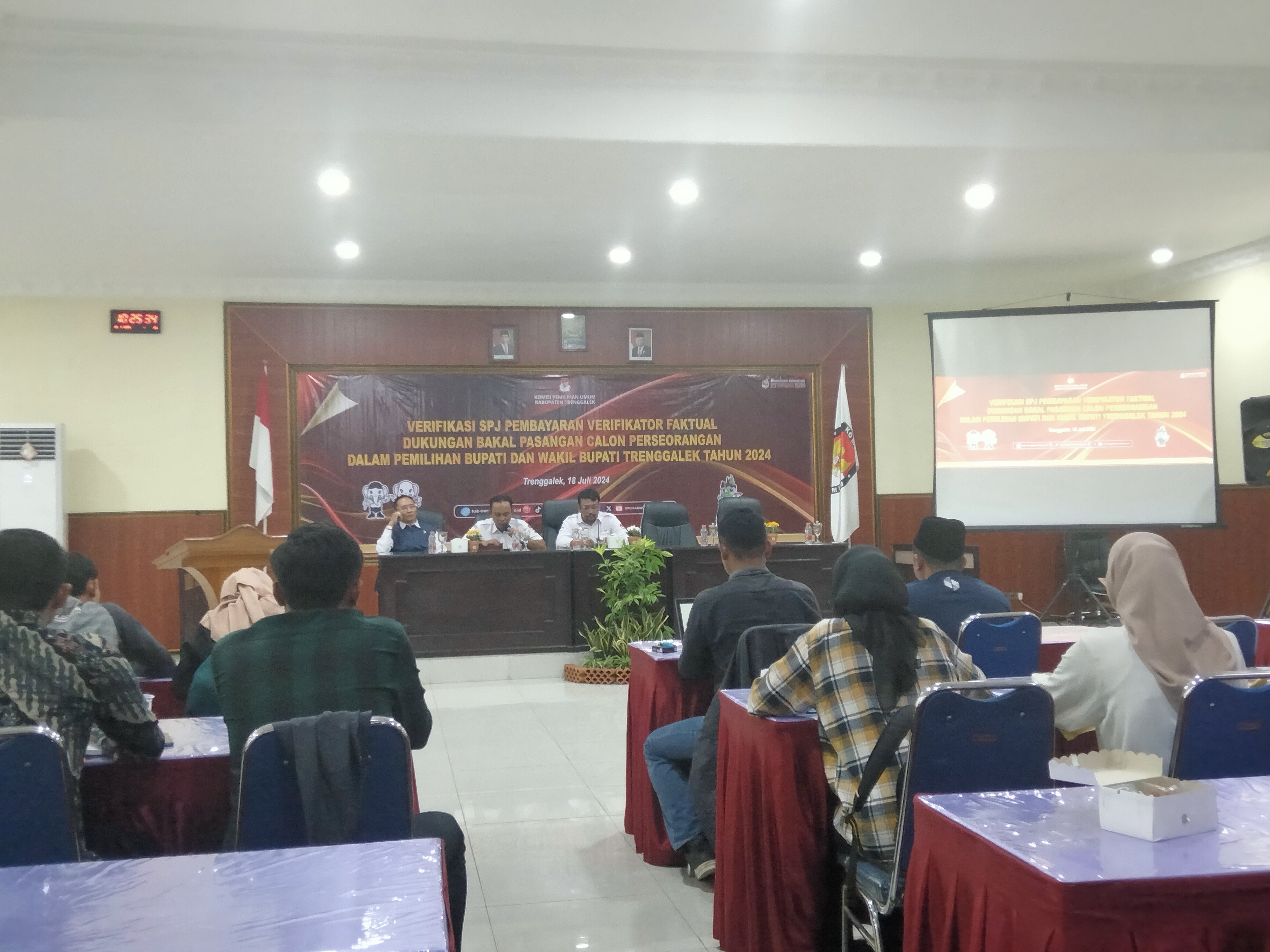 Hari ini, Kamis, tanggal 18 Juli 2024, Komisi Pemilihan Umum Kabupaten Trenggalek menyelenggarakan kegiatan Raker Verifikasi SPJ Pembayaran Verifikator Faktual Dukungan Bakal Pasangan Calon Perseorangan dalam Pemilihan Bupati dan Wakil Bupati Trenggalek Tahun 2024. Kegiatan yang diselenggarakan di Hall Rumah Makan Mekarsari Trenggalek tersebut dihadiri oleh Plh. Sekretaris beserta jajaran Sekretariat KPU Kabupaten Trenggalek, Bawaslu Kabupaten Trenggalek, Bakesbangpol Trenggalek, dan Anggota PPK Divisi Teknis Penyelenggaraan beserta Bendahara PPK se-Kabupaten Trenggalek. Acara dimulai pukul 10.00 WIB oleh MC diawali dengan Menyanyikan Lagu Kebangsaan Indonesia Raya yang dipimpin oleh Dirigen. Acara dilanjutkan dengan Pembacaan Doa yang dipimpin oleh Mukti, Anggota PPK Divisi Teknis Penyelenggaraan Kecamatan Watulimo. Acara dibuka secara resmi oleh Plh. Sekretaris KPU Kabupaten Trenggalek, Akhmad Rudy Bastari.