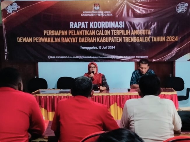 Hari ini, Jumat, 12 Juli 2024, Komisi Pemilihan Umum Kabupaten Trenggalek menyelenggarakan Rapat Koordinasi Persiapan Pelantikan Calon Terpilih Anggota DPRD Kabupaten Trenggalek Hasil Pemilu Tahun 2024. Acara yang diselenggarakan di Kantor KPU Kabupaten Trenggalek tersebut dihadiri oleh Ketua dan Sekretaris KPU Kabupaten Trenggalek beserta jajaran Sekretariat, LO dan Admin parpol peserta Pemilu Tahun 2024, Bawaslu Kabupaten Trenggalek serta Bakesbangpol Trenggalek. Acara dibuka oleh Ketua KPU Kabupaten Trenggalek, Istatiin Nafiah, pada pukul 13.30 WIB. Dalam sambutannya, Istatiin menyampaikan bahwa rakor bertujuan untuk membahas dan mengoordinasikan apa saja yang dibutuhkan dalam persiapan Pelantikan Calon Terpilih Anggota DPRD Kabupaten Trenggalek Hasil Pemilu Tahun 2024. Istatiin menjelaskan bahwa langkah pertama yang dilakukan adalah pemberitahuan calon terpilih Anggota DPRD Kabupaten Trenggalek Hasil Pemilu Tahun 2024. Pemberitahuan Calon Terpilih Anggota DPRD Kabupaten Trenggalek dilakukan dengan mekanisme sebagaimana tertuang dalam Peraturan KPU Nomor 6 Tahun 2024 pasal 45 ayat (1) bahwa pemberitahuan calon terpilih Anggota DPRD, DPRD Provinsi, dan DPRD Kabupaten/Kita dilakukan setelah ditetapkan oleh KPU, KPU Provinsi, KPU Kabupaten/Kota. Untuk Calon Terpilih Anggota DPRD Kabupaten Trenggalek maka ditetapkan oleh KPU Kabupaten Trenggalek. Lebih lanjut, Dijelaskannya dalam pasal 45 ayat (2) PKPU Nomor 6 Tahun 2024 tersebut bahwa pemberitahuan disampaikan secara tertulis kepada pengurus partai politik sesuai dengan tingkatannya dengan tembusan kepada calon terpilih yang bersangkutan.