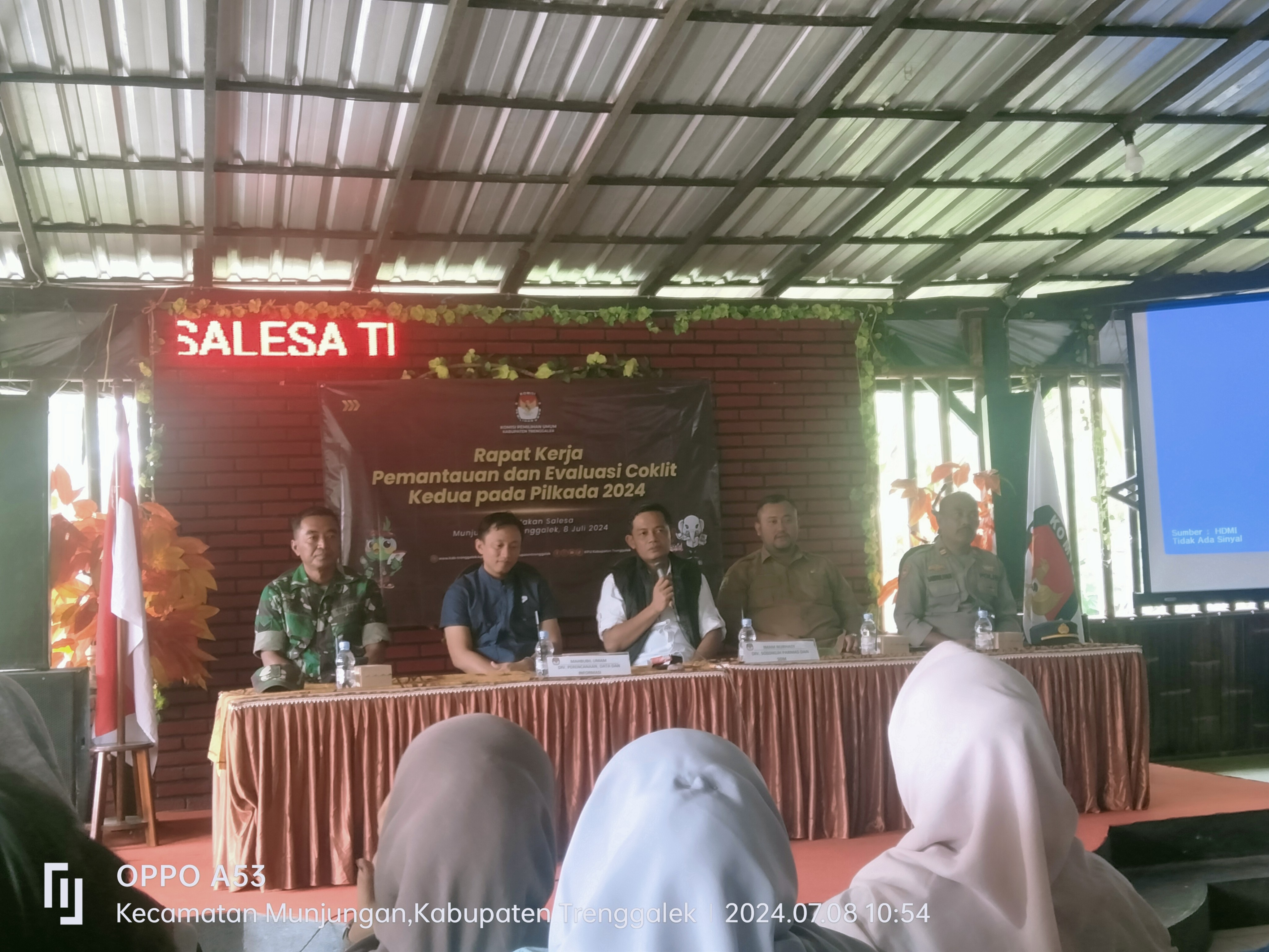 Hari ini, Senin, tanggal 8 Juli 2024, Komisi Pemilihan Umum Kabupaten Trenggalek menyelenggarakan kegiatan Rapat Kerja Pemantauan dan Evaluasi Coklit Kedua dalam Tahapan Pencocokan dan Penelitian Data Pemilih Pemilihan Serentak Tahun 2024. Kegiatan yang diselenggarakan di Hall Kedai Makan Salesa Munjungan tersebut dihadiri oleh 2 (dua) Anggota KPU Kabupaten Trenggalek yaitu Divisi Perencanaan, Data, dan Informasi serta Divisi Sosialisasi, Pendidikan Pemilih, Partisipasi Masyarakat dan Sumber Daya Manusia, beserta Sekretariat KPU Kabupaten Trenggalek, Camat beserta Forkopimda Munjungan, dan PPK Divisi Data dan Informasi serta Divisi Sosdiklih-Parmas dan SDM se-kabupaten Trenggalek. Acara dimulai pukul 10.00 WIB diawali Menyanyikan Lagu Kebangsaan Indonesia Raya yang dipimpin oleh Dirigen, Iis Setyaningsih, Anggota PPK Munjungan Divisi Hukum dan Pengawasan. Acara dilanjutkan dengan Pembacaan Doa yang dipimpin oleh Zainal Fuad, Anggota PPK Kampak Divisi Data dan Informasi.