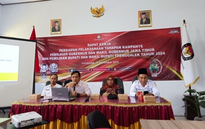 Hari ini, Rabu, 18 September 2024, Komisi Pemilihan Umum Kabupaten Trenggalek menyelenggarakan Rapat Kerja Persiapan Pelaksanaan Tahapan Kampanye Pemilihan Gubernur dan Wakil Gubernur Jawa Timur serta Pemilihan Bupati dan Wakil Bupati Trenggalek Tahun 2024. Kegiatan yang dilaksanakan di Aula Kantor KPU Kabupaten Trenggalek tersebut dihadiri oleh Ketua dan Anggota KPU Kabupaten Trenggalek Divisi Sosialisasi, Pendidikan Pemilih, Partisipasi Masyarakat dan Sumber Daya Manusia, Sekretariat KPU Kabupaten Trenggalek, Bakesbangpol Trenggalek, Bawaslu Kabupaten Trenggalek serta Anggota PPK se-Kabupaten Trenggalek yang membidangi Parmas Sosdiklih Sekabupaten Trenggalek. Acara dibuka secara resmi oleh Ketua KPU Kabupaten Trenggalek, Istatiin Nafiah, pada pukul 09.30 WIB.