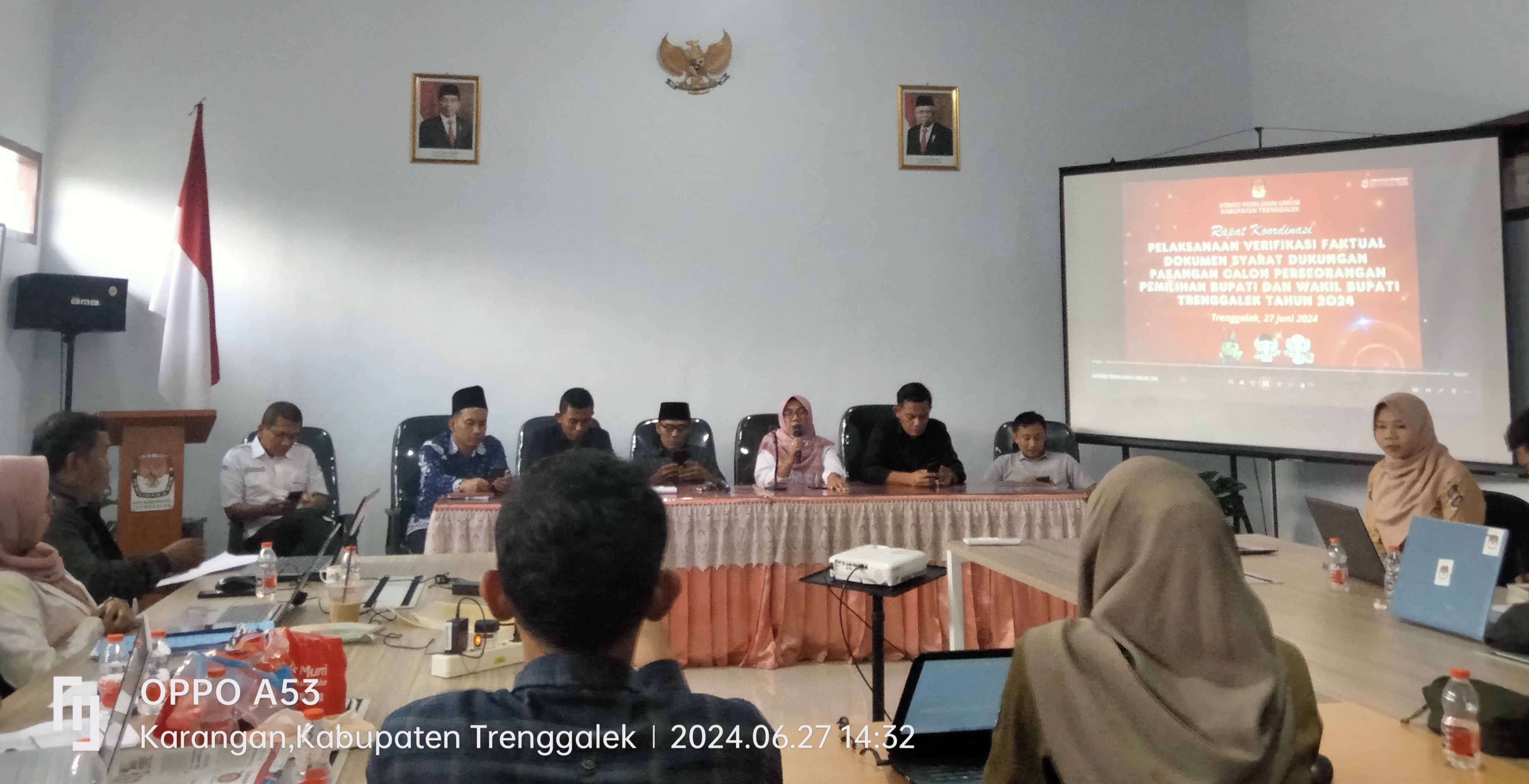 Hari ini, Kamis, tanggal 27 Juni 2024, Komisi Pemilihan Umum Kabupaten Trenggalek menyelenggarakan Rapat Koordinasi Pelaksanaan Verifikasi Faktual Dukungan Bakal Calon Perseorangan Pemilihan Bupati dan Wakil Bupati Trenggalek Tahun 2024. Kegiatan yang diselenggarakan di Ruang Rapat KPU Kabupaten Trenggalek tersebut dihadiri oleh Ketua, seluruh Anggota KPU Kabupaten Trenggalek, Sekretaris dan Staf Sekretariat KPU Kabupaten Trenggalek, Bawaslu Kabupaten Trenggalek dan PPK Divisi Teknis Penyelenggaraan se-kabupaten Trenggalek. Acara dibuka secara resmi pada pukul 13.30 WIB oleh Ketua KPU Kabupaten Trenggalek, Istatiin Nafiah.