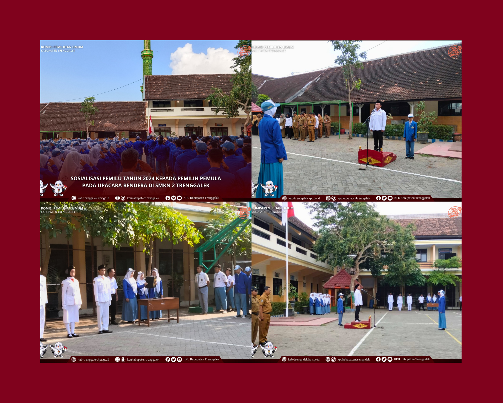 Hari ini, Senin, tanggal 30 Oktober 2023, Komisi Pemilihan Umum Kabupaten Trenggalek bekerjasama dengan SMK Negeri 2 Trenggalek menyelenggarakan Sosialisasi dan Pendidikan Pemilih dalam Upacara Bendera di SMK Negeri 2 Trenggalek. Kegiatan tersebut merupakan upaya KPU untuk meningkatkan partisipasi pemilih pada Pemilu Tahun 2024. Hadir dari KPU Kabupaten Trenggalek yaitu Muhammad Indra Setiawan, Anggota KPU Kabupaten Trenggalek Divisi Perencanaan, Data dan Informasi, bersama Haji Misdiyanto, Kasubbag Teknis Penyelenggaraan Pemilu, Partisipasi dan Hubungan Masyarakat beserta Woro Wikan Maheswari, staf subbag Teknis Penyelenggaraan Pemilu, Partisipasi, dan Hubungan Masyarakat. Upacara dimulai pada pukul 07.00 WIB dan dimulai dengan persiapan barisan, penghormatan, dan laporan kepada Pembina Upacara. Upacara dilanjutkan dengan Pengibaran Bendera Merah-putih diiringi Lagu Kebangsaan Indonesia Raya, Mengheningkan Cipta dan Pembacaan Pancasila serta Pembukaan Undang-undang Dasar Negara Republik Indonesia Tahun 1945. Selanjutnya amanat Pembina Upacara.