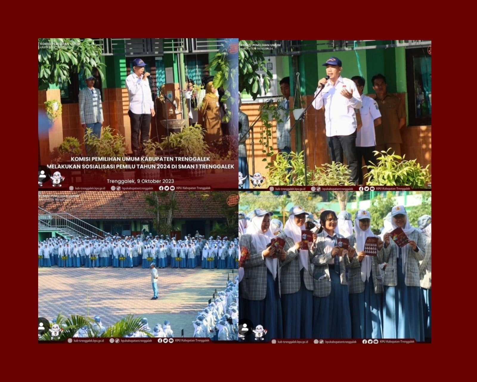 Hari ini, Senin, tanggal 9 Oktober 2023, Komisi Pemilihan Umum Kabupaten Trenggalek menyelenggarakan sosialisasi dan pendidikan pemilih untuk meningkatkan partisipasi pemilih pada Pemilu Tahun 2024. Kegiatan tersebut dilaksanakan pada Upacara Bendera Hari Senin di SMA Negeri 1 Trenggalek. Rombongan terdiri dari Anggota KPU Kabupaten Trenggalek Divisi Sosialisasi, Pendidikan Pemilih, Partisipasi dan Hubungan Masyarakat serta Staf Subbagian Teknis Penyelenggaraan Pemil, Partisipasi, dan Hubungan Masyarakat. Bertindak sebagai Pembina Upacara, Nurani, Anggota KPU Kabupaten Trenggalek Divisi Sosialisasi, Pendidikan Pemilih, Partisipasi Masyarakat dan Sumber Daya Manusia menyampaikan bahwa pemilih pemula dapat berperan dalam penyelenggaraan Pemilu Tahun 2024. Peran Ter dapat diwujudkan dengan menjadi pemilih yang rasional. Terkait usia pemilih, Nurani menyampaikan bahwa usia pemilih adalah minimal 17 tahun atau sudah kawin. Tentunya, untuk siswa-siswi SMA Negeri 1 Trenggalek telah ada yang berusia 17 tahun maupun lebih dari 17 tahun. Untuk itu, dirinya berharap agar siswa-siswi yang telah cukup umur untuk segera mengurus KTP elektronik dan menggunakan hak pilih pada hari pemungutan suara Pemilu Tahun 2024 yang diselenggarakan pada hari Rabu tanggal 14 Februari 2024 mendatang. Ditambahkannya, dirinya juga berpesan agar para guru dan siswa-siswi untuk berpartisipasi dalam tahapan Pemilu Tahun 2024. Para guru dapat berpartisipasi sebagai KPPS pada Pemungutan dan Penghitungan Suara Pemilu Tahun 2024.