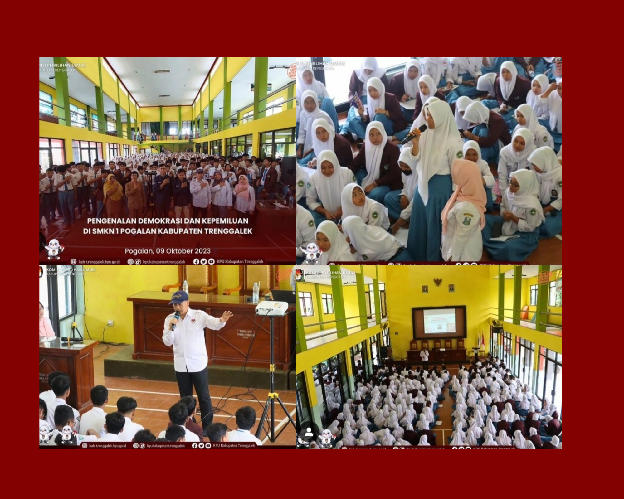 Rangkaian sosialisasi dan pendidikan pemilih dalam rangka meningkatkan partisipasi pemilih pada Pemilu Tahun 2024 terus berjalan. Hari ini, Senin, tanggal 9 Oktober 2023, Komisi Pemilihan Umum Kabupaten Trenggalek menyelenggarakan sosialisasi dan pendidikan pemilih untuk meningkatkan partisipasi pemilih pada Pemilu Tahun 2024. Kegiatan tersebut dimulai pada pukul 10.00 WIB dan dilaksanakan di Aula SMK Negeri 1 Pogalan. Rombongan terdiri dari Anggota KPU Kabupaten Trenggalek Divisi Sosialisasi, Pendidikan Pemilih, Partisipasi dan Hubungan Masyarakat serta Staf Subbagian Teknis Penyelenggaraan Pemilu, Partisipasi, dan Hubungan Masyarakat. Bertindak sebagai narasumber, Nurani, Anggota KPU Kabupaten Trenggalek Divisi Sosialisasi, Pendidikan Pemilih, Partisipasi Masyarakat dan Sumber Daya Manusia menyampaikan bahwa pemilih pemula dapat berperan dalam penyelenggaraan Pemilu Tahun 2024. Peran itu dapat diwujudkan dengan menjadi pemilih yang rasional. Terkait usia pemilih, Nurani menyampaikan bahwa usia pemilih adalah minimal 17 tahun atau sudah kawin. Tentunya, untuk siswa-siswi SMA Negeri 1 Trenggalek telah ada yang berusia 17 tahun maupun lebih dari 17 tahun. Untuk itu, dirinya berharap agar siswa-siswi yang telah cukup umur untuk segera mengurus KTP elektronik dan menggunakan hak pilih pada hari pemungutan suara Pemilu Tahun 2024 yang diselenggarakan pada hari Rabu tanggal 14 Februari 2024 mendatang. Ditambahkannya, dirinya juga berpesan agar para guru dan siswa-siswi untuk berpartisipasi dalam tahapan Pemilu Tahun 2024. Para guru dapat berpartisipasi sebagai KPPS pada Pemungutan dan Penghitungan Suara Pemilu Tahun 2024. Dalam kesempatan tersebut juga dibagikan selebaran yang berisi informasi kepemiluan.
